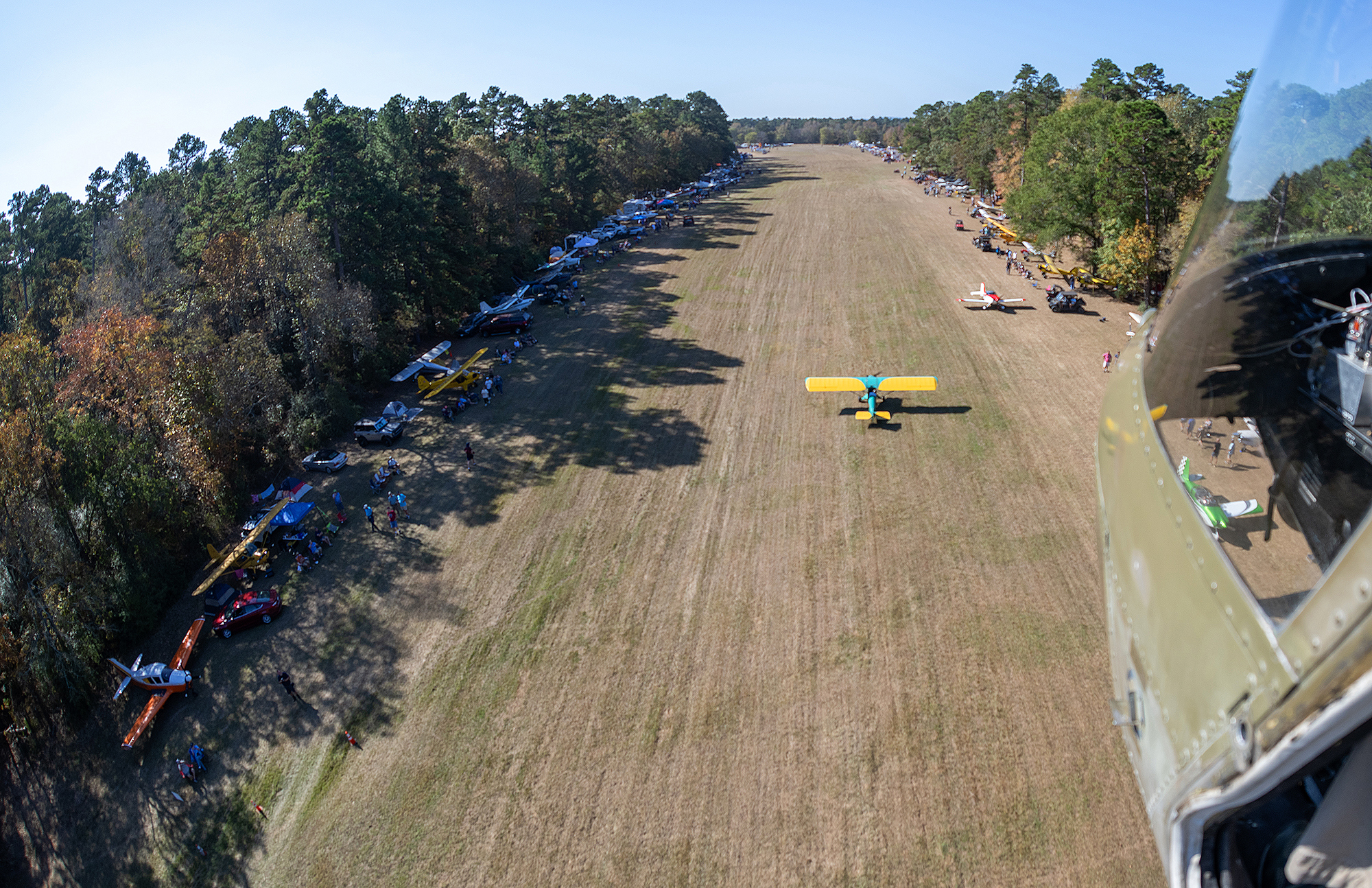 The fly-in is a three-day event, Friday through Sunday. I arrived on Saturday in a 1972 olive-drab, Vietnam-era OH-58A Kiowa piloted by owner, Russell Armstrong. Seeing the 3500’ x 250’ swath carved out of the 70-foot-tall forest, with a 50-foot-wide runway (02/20) running down the center, made for an impressive site. With Russell hovering the Kiowa slowly over the treetops, I took aerial images of the entire area in between waving to the friendly folks waving up at our whirlybird.