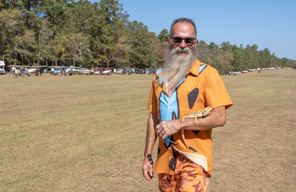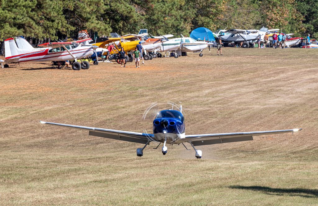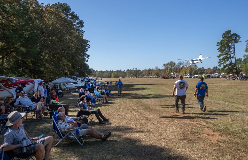 The pleasant east Texas fall weather had aviators visiting from across the state. Hundreds of aircraft attended throughout the weekend. Many camped with their aircraft along both forest edges of the wide, grass field. Parked along the tree lines and in the open areas were vintage, modern, warbirds, and experimental aircraft. Even ultralights, gyrocopters, and helicopters joined in on the fun. For three days, the plane watching was exciting, as all manner of prop driven machines landed, took off, or just zoomed by, causing the armchair aviators, lining the runway in their camp chairs, to brag that they could have done it better.