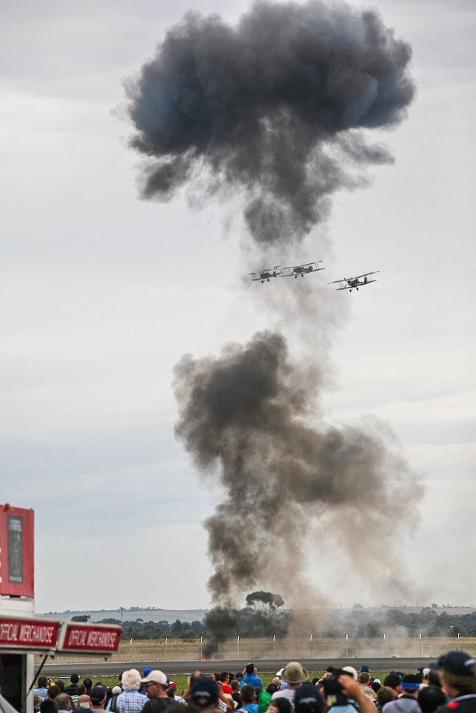 Leading the drawcard were performances from the Australian Vintage Aviation Society and the New Zealand-based The Vintage Aviator Ltd. which displayed a variety of accurate replica WWI aircraft on the Saturday show. The sight of these WWI biplanes and triplanes wheeling through the air gripped everyone’s attention! Aircraft in these displays included a Fokker Dr.I triplane, a Pfalz D.III, Fokker D.VII, Fokker D.VIII, Nieuport 11, Airco DH.5, Sopwith Camel, RAF RE8, Bristol F.2B and RAF SE5a. Comparing these early wood and fabric flying machines to the modern jet-powered, computer driven fighters provided an impossible contrast. The massive leap forwards in technology and performance almost defies belief…….. We’ve come such a long way in 100years.