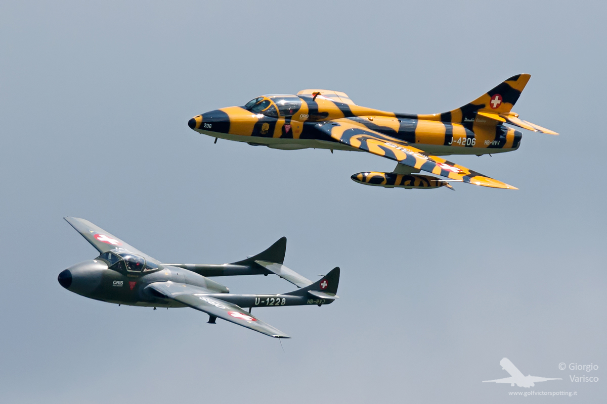 After some helicopter demos by the Swiss Air Force and JetMan’s flight, the Fliegermuseum Altenrhein (Altenrhein Flying Museum) sent two of its airworthy jet warbirds; a DH.115 Vampire T.55 (license-built by F+W in Emmen), and a Hawker Hunter T Mk.58. The Hunter wears a tiger livery dedicated to the Swiss Air Force’s Fliegerstaffel 11.