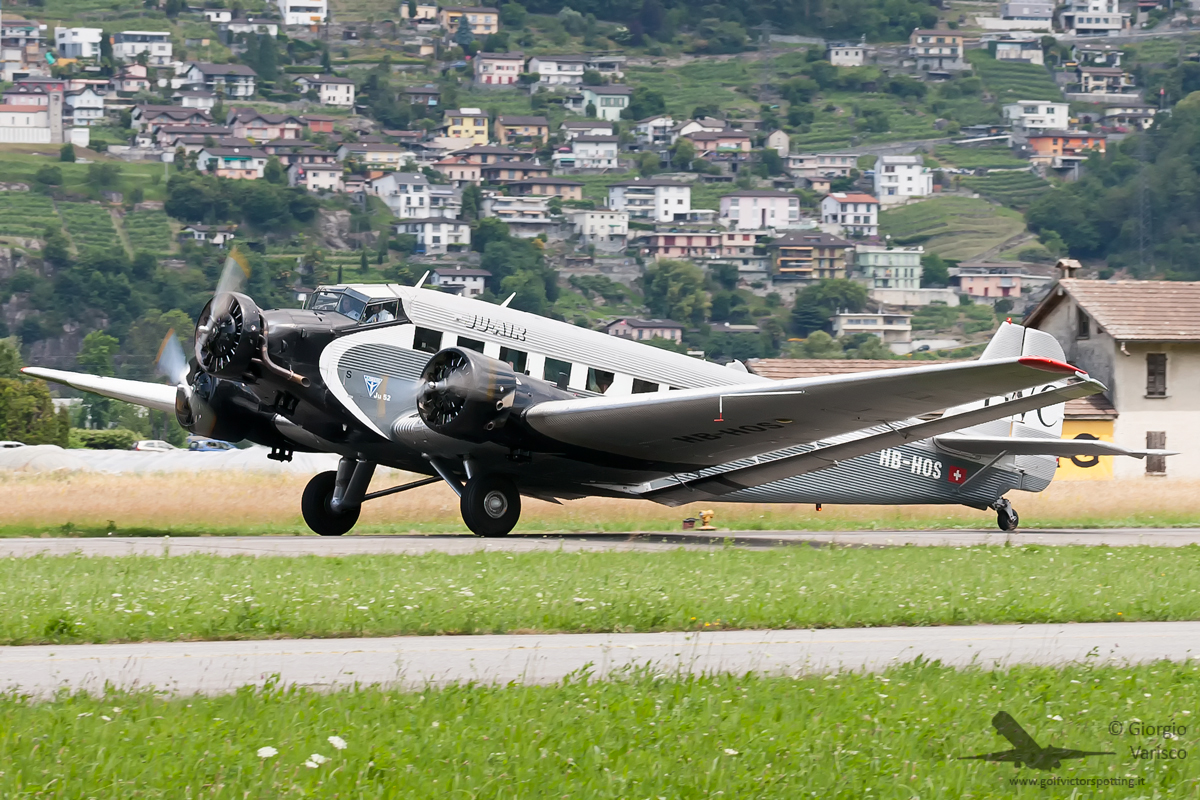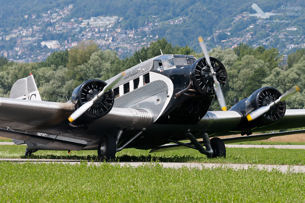 A Junkers Ju-52/3m g4e, one of four operated by Ju-Air, performed touristic flights above the Magadino Plain and Lago Maggiore. In the early afternoon it took off with seventeen paratroopers on board, three of whom carried flags representing Switzerland, the Canton of Ticino and the Swiss Air Force. Upon landing, the three flags were hoisted during a speech by the airfield’s military commander, colonel Tiziano Ponti.