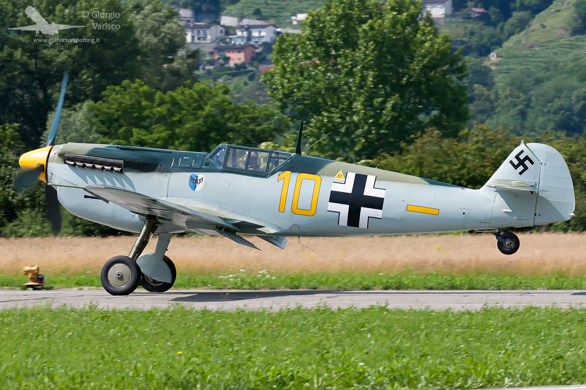 A very rare, German-built Messerschmitt Bf.108B-1 Taifun also took part in the air show (see below). This was one of fifteen Taifuns bought by the Swiss Air Force in 1938 and used for liaison duties and as trainers for pilots of Swiss Bf.109s. Retired in 1959, the aircraft was on display in Zürich-Kloten airport for 30 years before the Association pour le Maintien du Patrimoine Aéronautique bought and restored her to airworthiness.