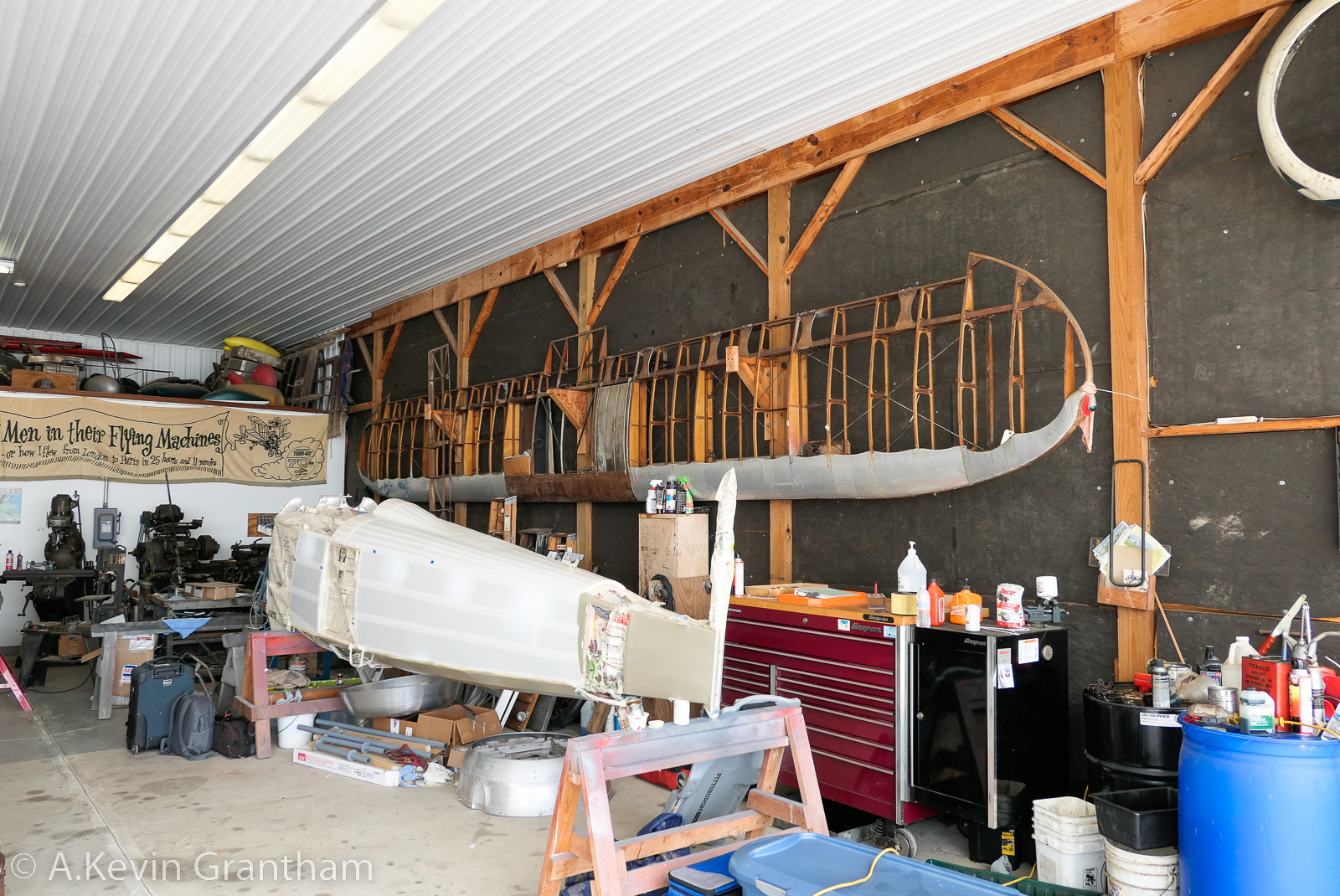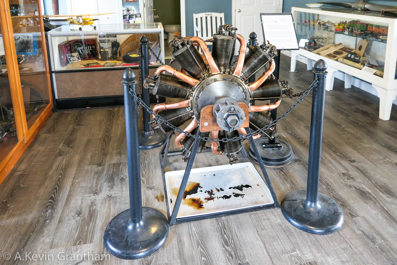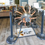 An original WWI-era rotary engine in its cradle. These engines are particularly unusual, by modern standards, in that it is the engine’s crank shaft which is bolted to the airframe (not the engine). The engine, with the propeller bolted to the casing, spins around the crank shaft, which means that there are enormous gyroscopic forces in play during flight! (photo by A. Kevin Grantham)