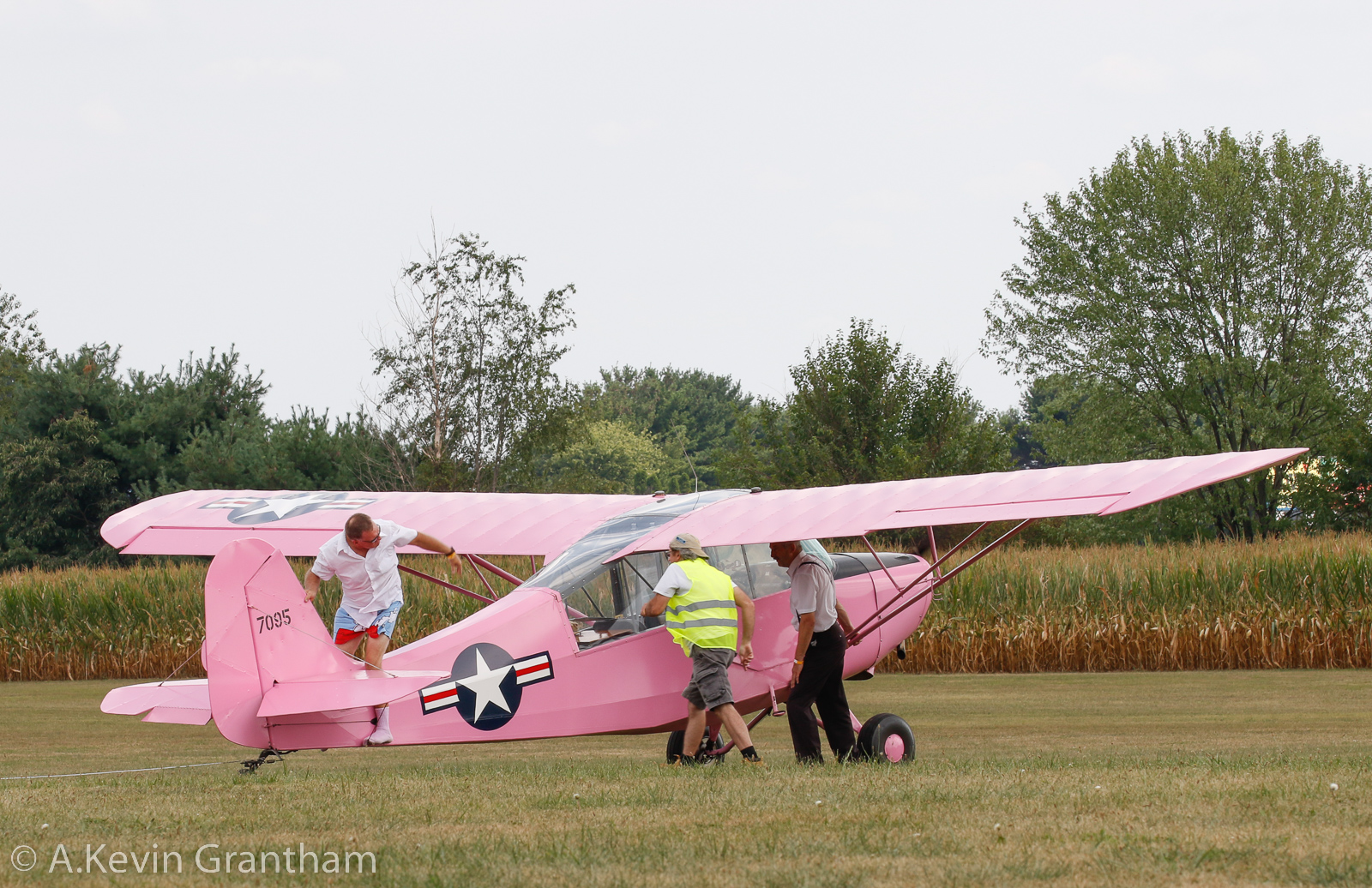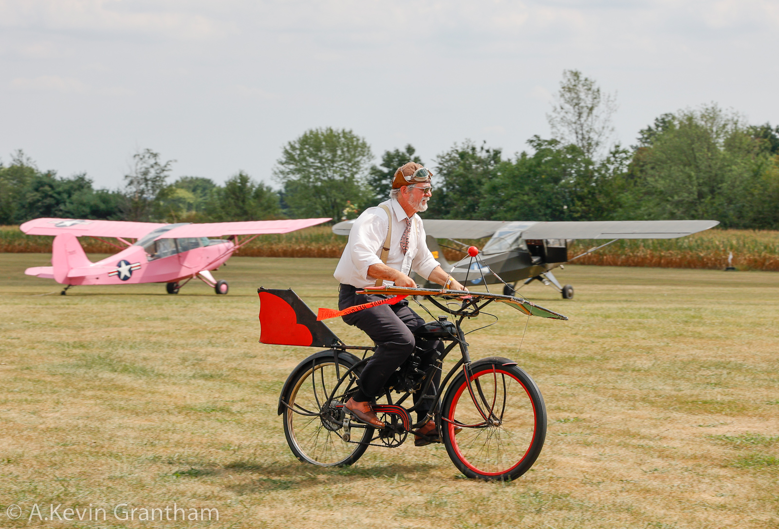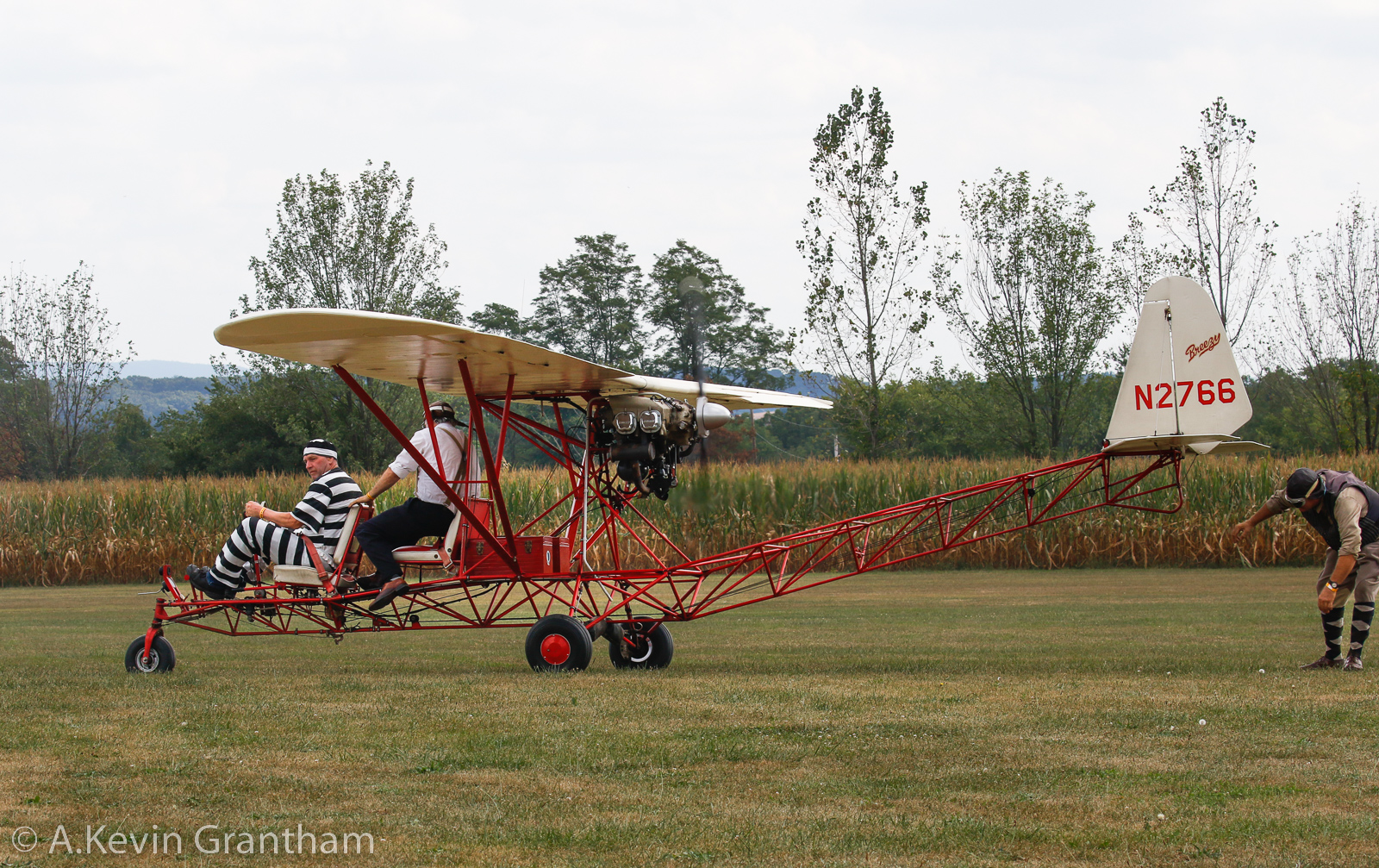 For that matter, the show announcers and Police have been less than successful in getting rid of Zeek, shown here checking out the pink Aeronca. Gullywater pushes past the two men guarding the plane and mages to take control of the pink beauty despite having a cinder block anchored to its tail. (photo by A. Kevin Grantham)
