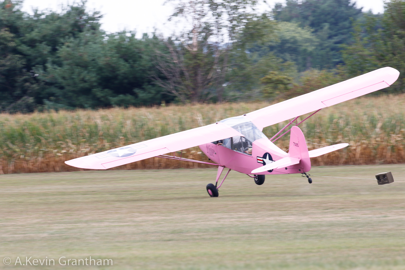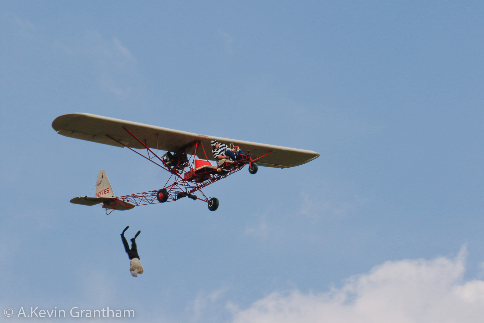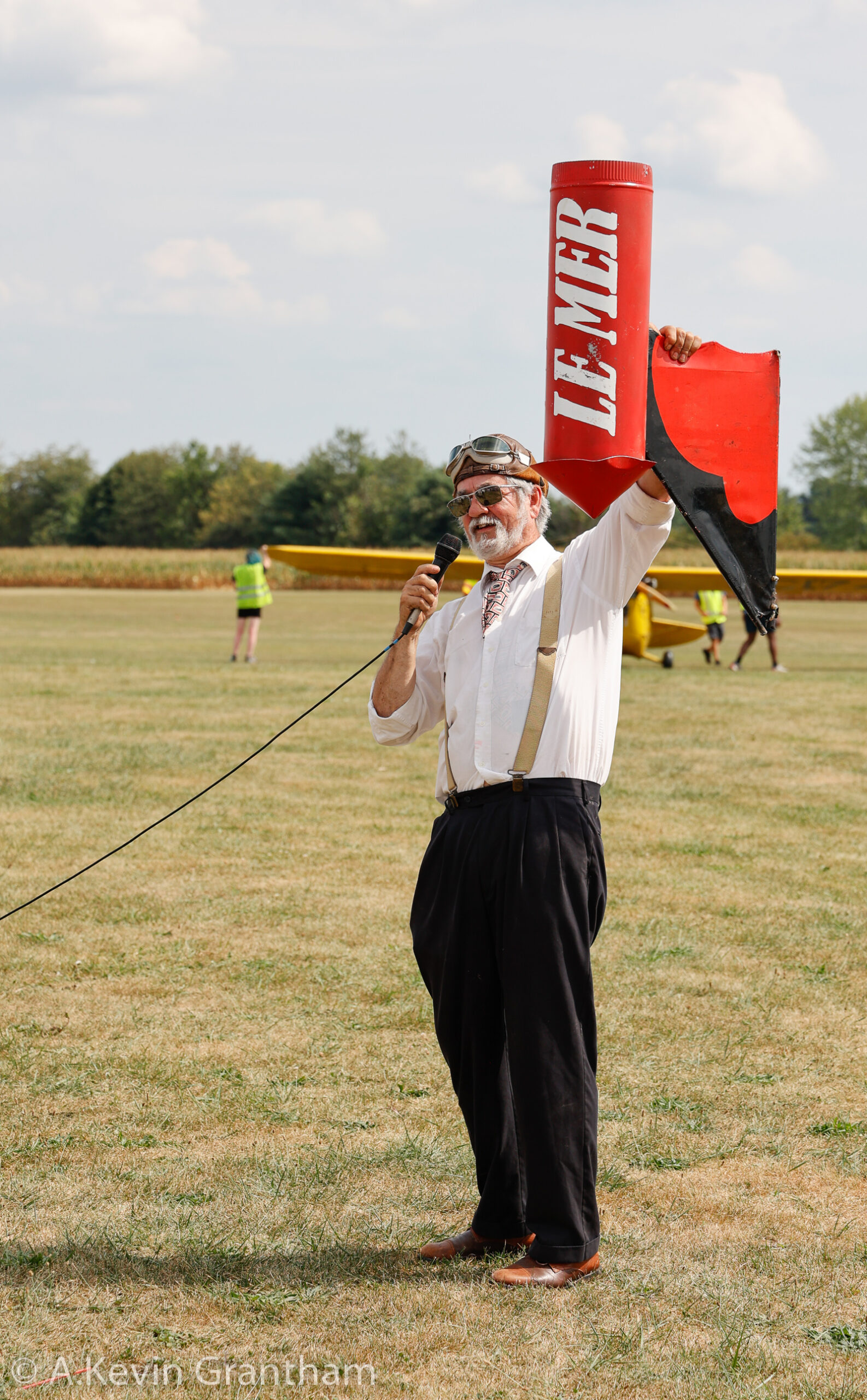 For that matter, the show announcers and Police have been less than successful in getting rid of Zeek, shown here checking out the pink Aeronca. Gullywater pushes past the two men guarding the plane and mages to take control of the pink beauty despite having a cinder block anchored to its tail. (photo by A. Kevin Grantham)