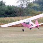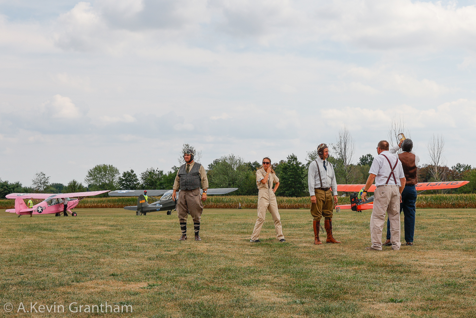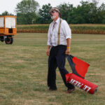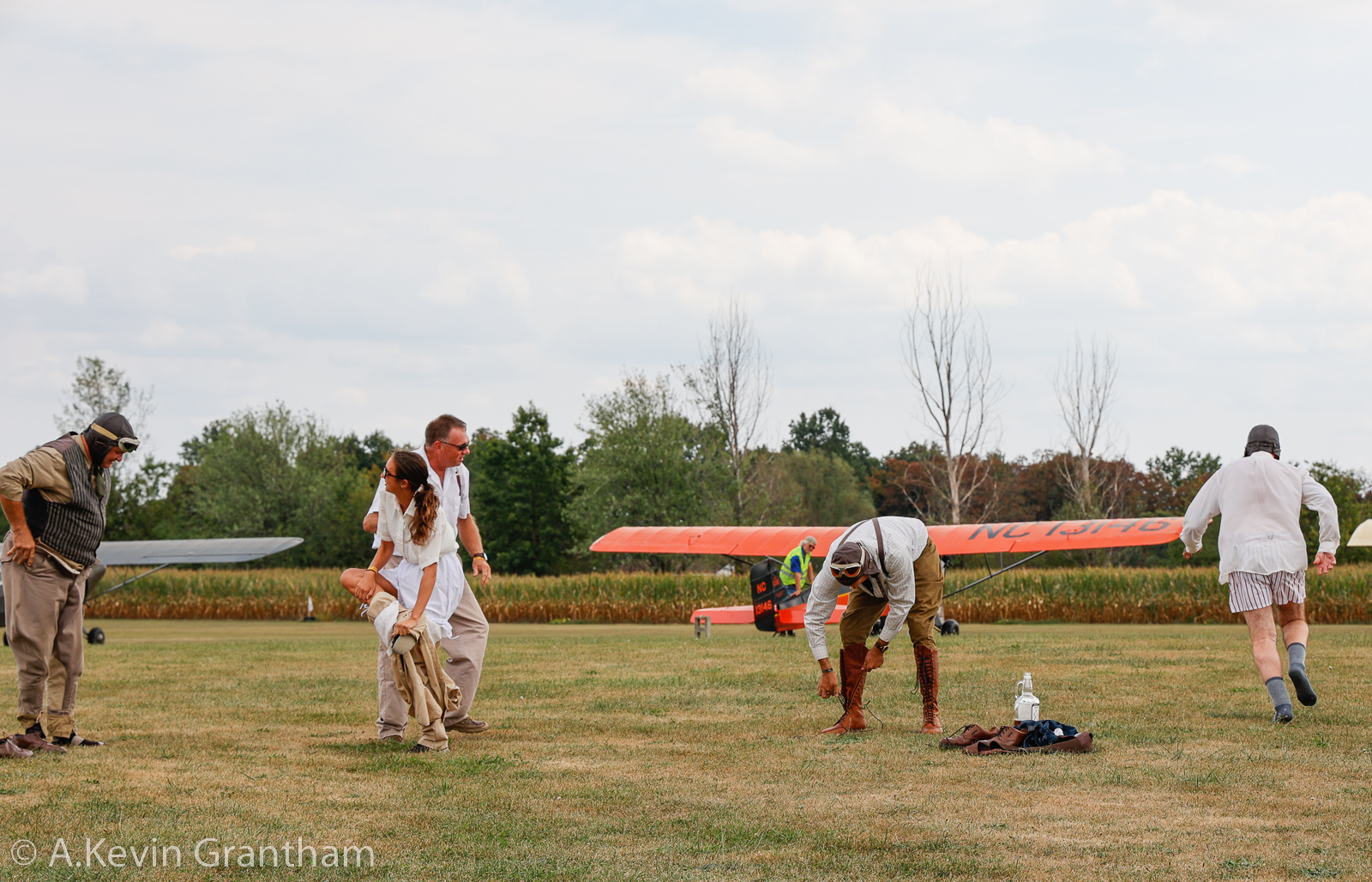 A racing competition also occurred during the show between Aeronica BCM, Taylor Craft DCO-65, 1930 Fleet 7, 1932 Pietenpol, and a Aeronca C-3. The top speeds for these aircraft differ significantly, so the race was handicapped with the winner completing the following tasks: First, all the participants were required to strip down to their underwear (bloomers for the ladies), then take off and complete the required laps around the field, and finally land and redress. Of course, their buddy Zeek Gullywater had to get into the act. It is also important to note that a cinder block was tied to the tail wheel of each airplane as a safety precaution. (photo by A. Kevin Grantham)