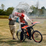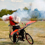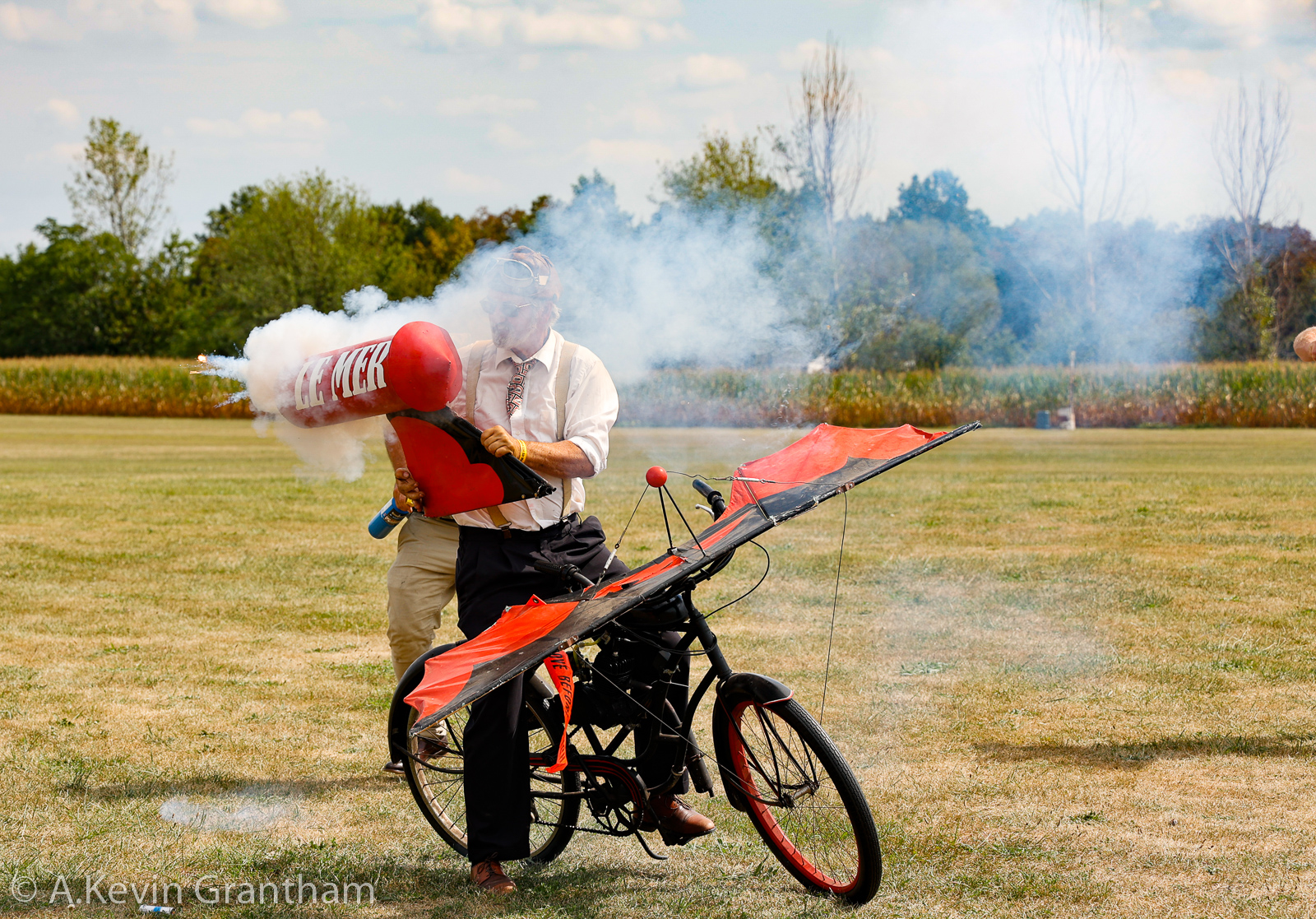 Professor De Air Le Mer provides some comedy relief by trying to get his power bicycle off the ground. Realizing he did not have enough thrust, he tried using rocket power, but the device exploded shortly after ignition. Fortunately, a bystander was there to save the professor’s life with a bucket of water. (photo by A. Kevin Grantham)