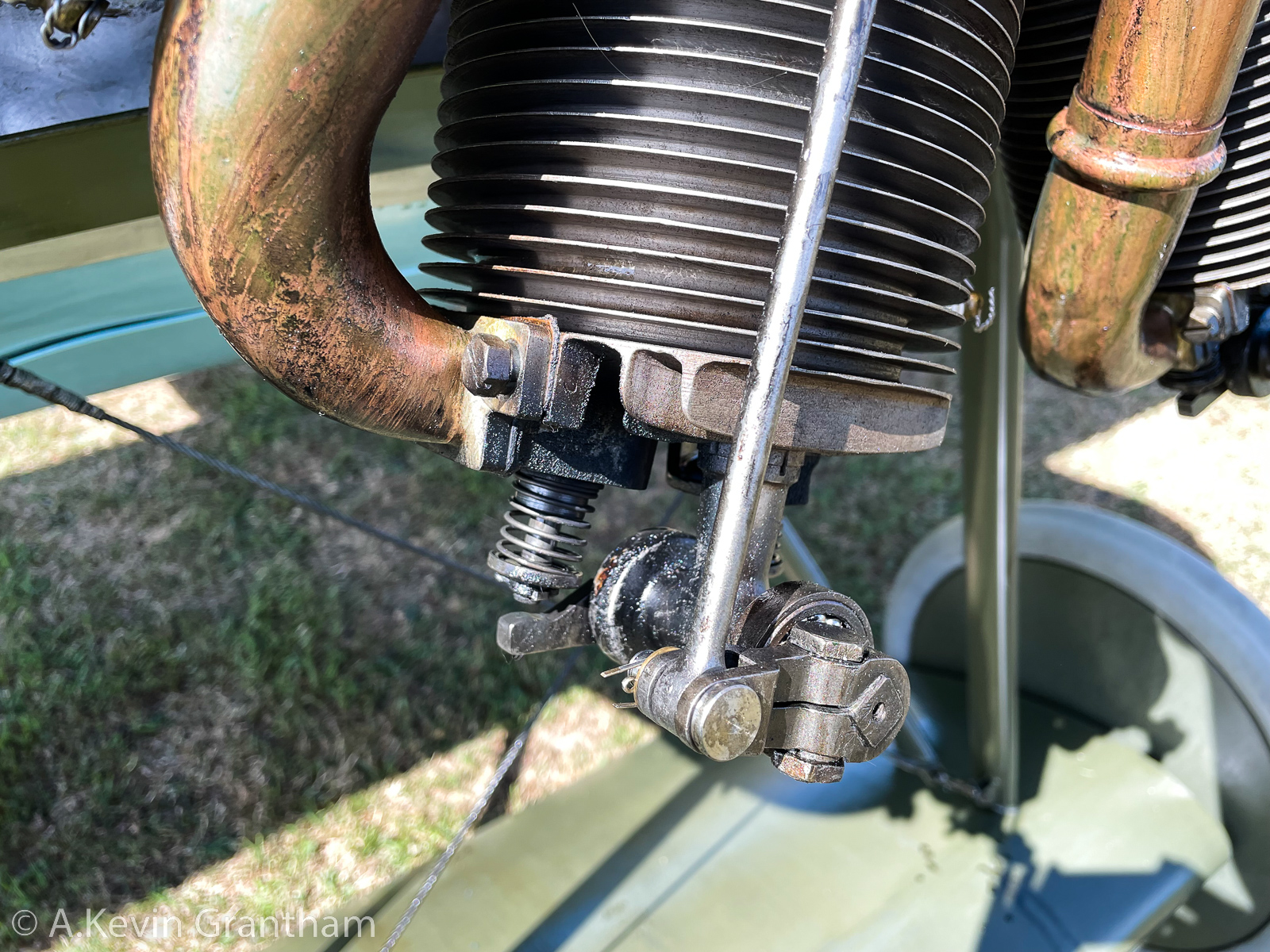 The cylinder head of an authentic Le Rhône engine. Each of the engine’s nine cylinders has to be manually primed and lubricated before each flight. (photo by A. Kevin Grantham)