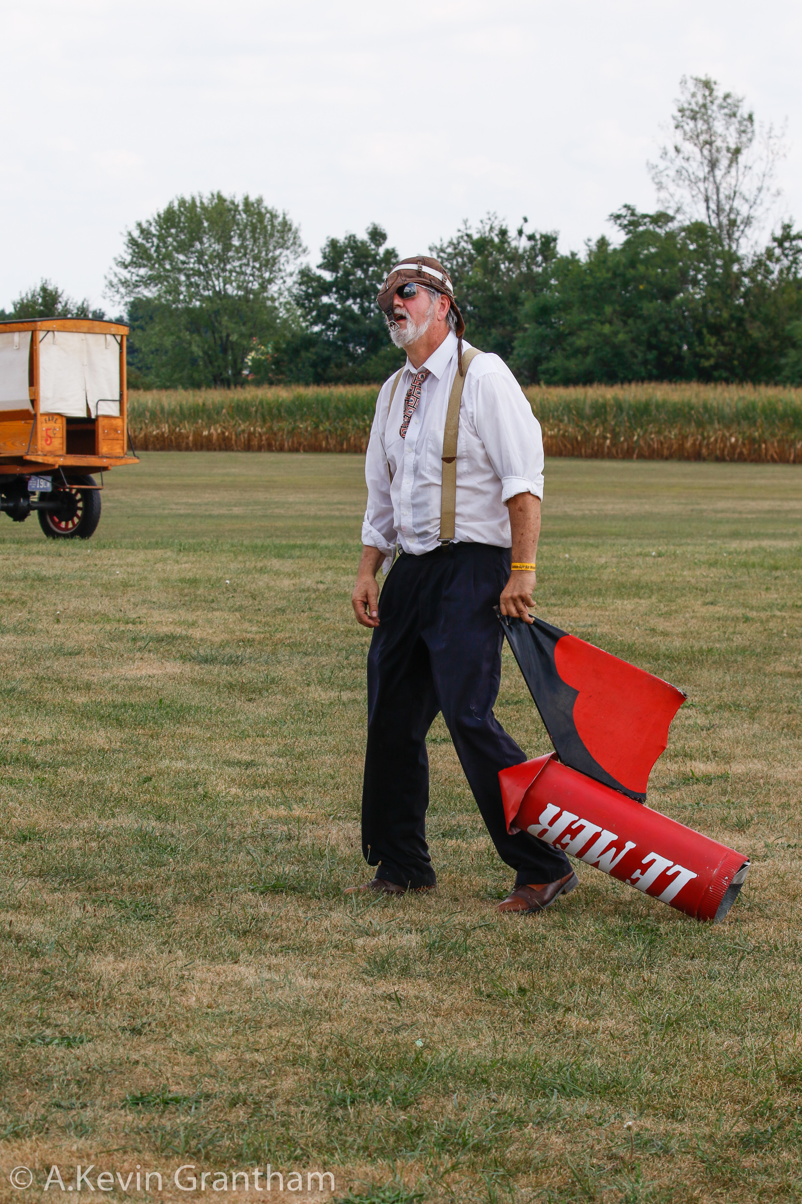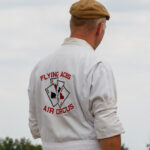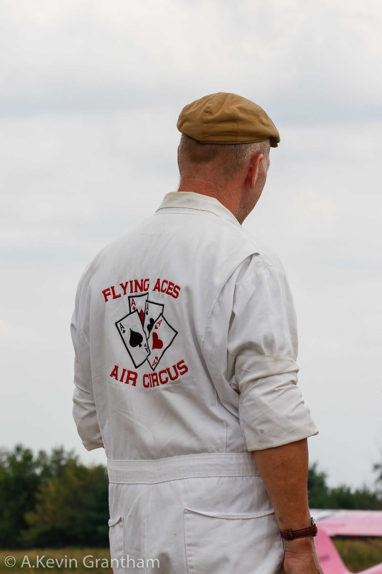 Andrew King is wearing Flying Aces Air Circus overalls getting ready for his next performance. (photo by A. Kevin Grantham)