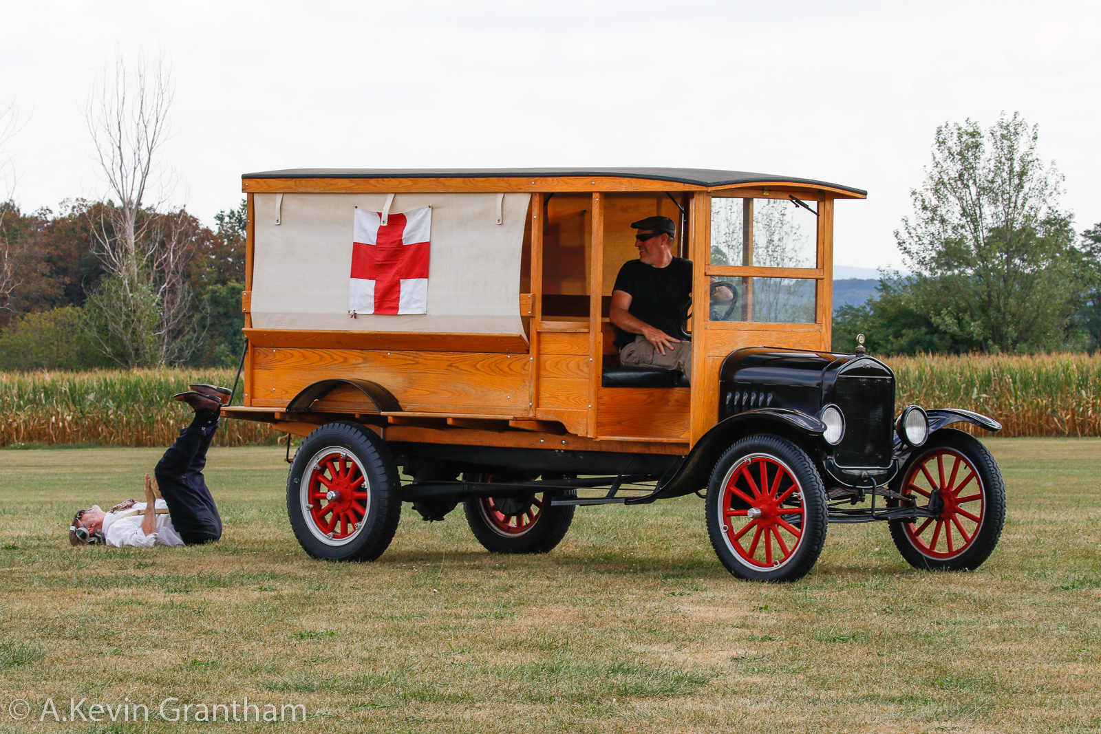 Two-Face Tony somehow escapes the clutches of the law and makes his way towards hijacking a Breezy-type aircraft occupied by none other than—Professor De Air Le Mer. Two-Face manages to take off, and a mid-air struggle ensues. Oh no, the professor is seen falling from the aircraft and hitting the ground with a thud! A nearby ambulance quickly arrives and gives the Professor life-saving medical attention but then dumps him out on the ground in front of the audience. The Professor is a little dischuffed but somehow survives the ordeal. (photo by A. Kevin Grantham)