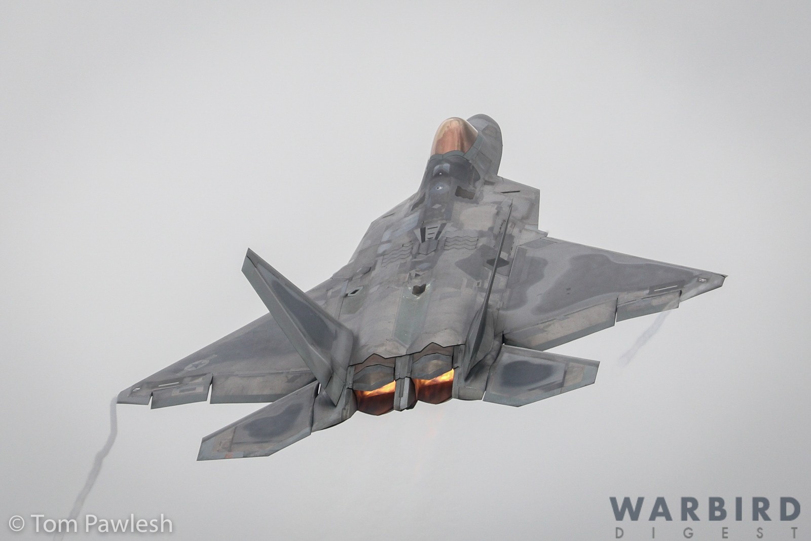 The F-22 Raptor heads skywards, afterburners lit. (photo by Tom Pawlesh)