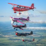 An unusual five-ship featuring (from bottom to top) Lou Horschel’s TF-51D Mustang ‘Mad Max’, Thom Richard’s P-40N, Rob Holland’s MXS-RH, Rick Volker’s Su-26M and Greg Koontz in his Super Decathalon. (photo by Tom Pawlesh)