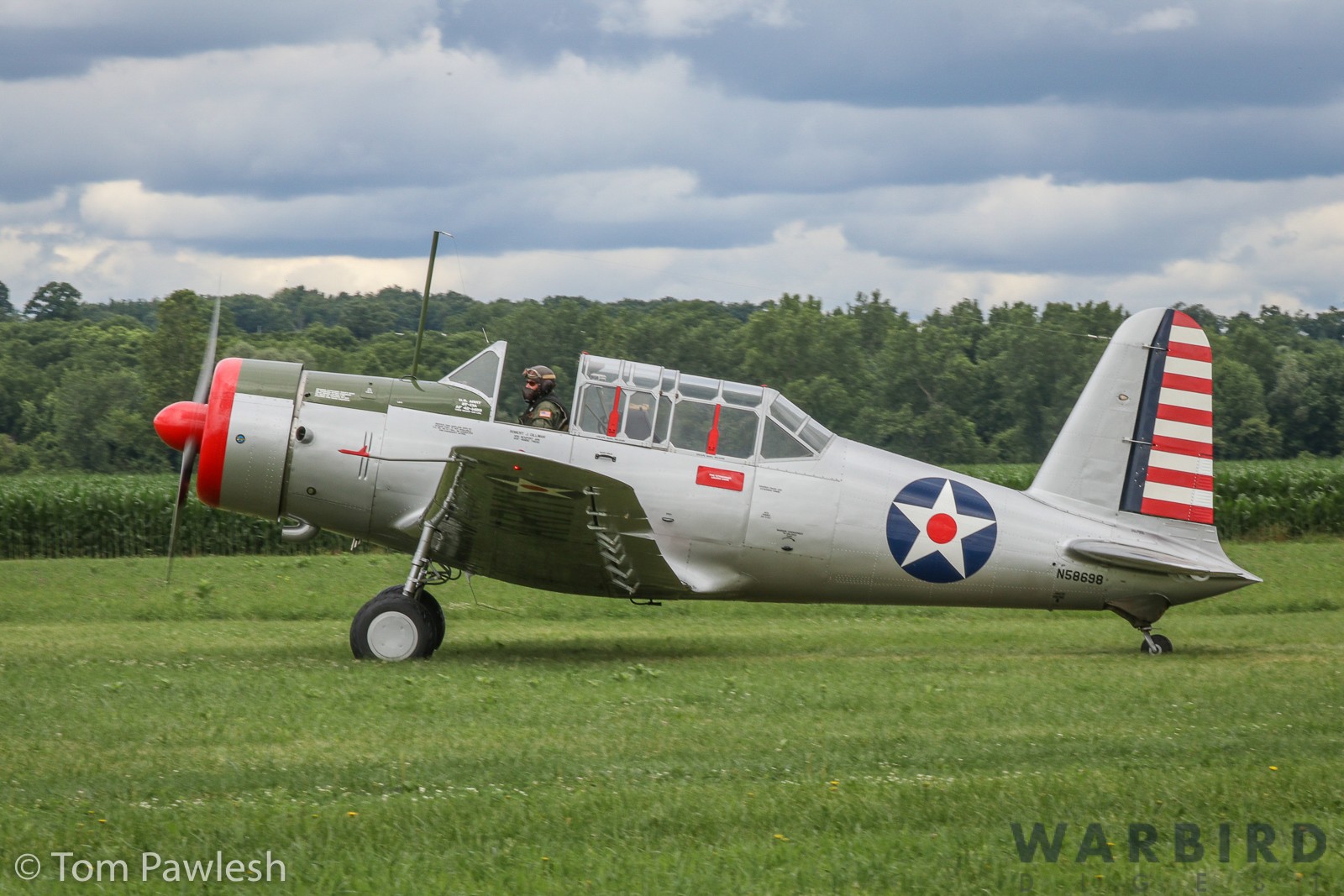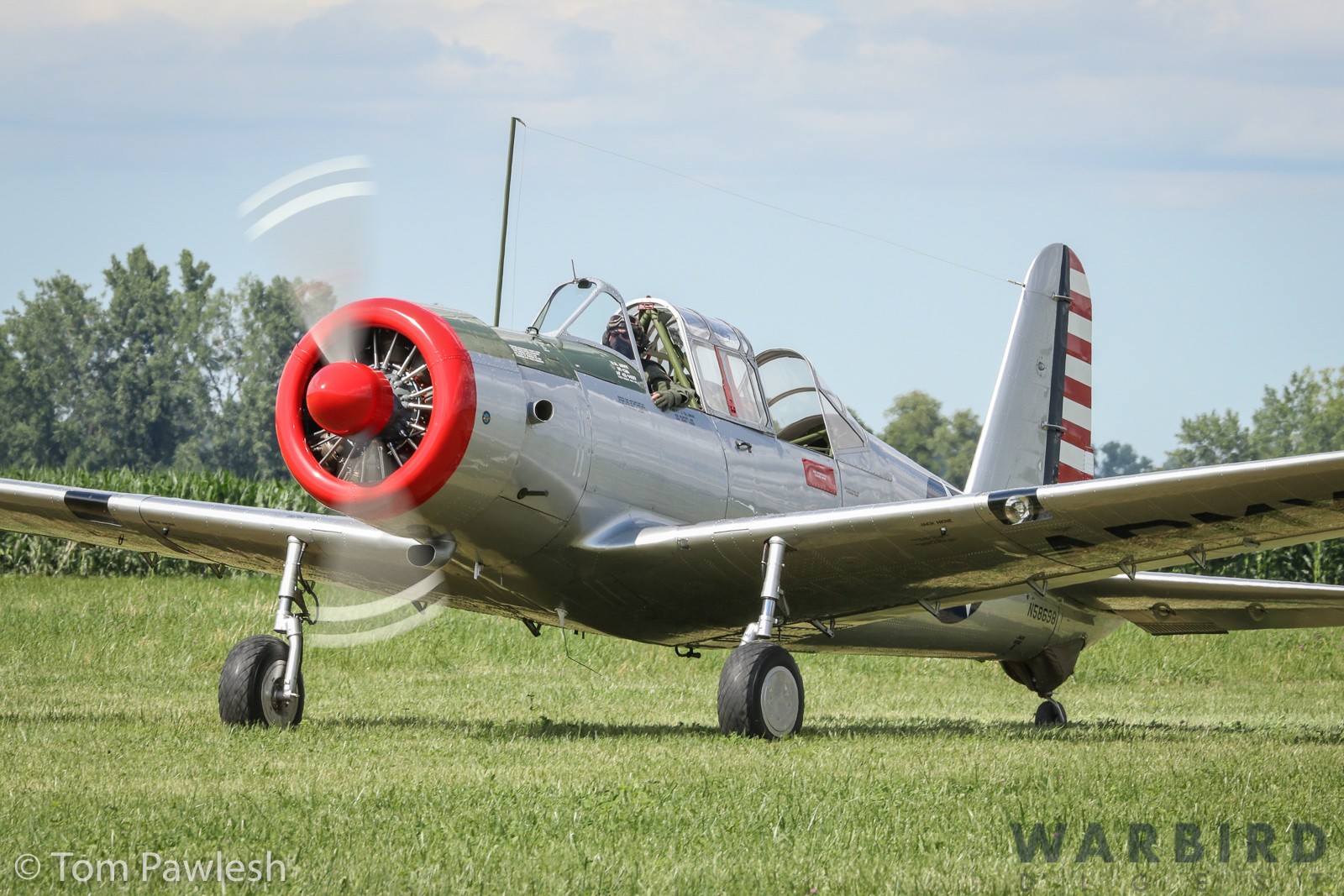 A Vultee Valiant taxiing along beside the famous Geneseo corn field which runs parallel to the airstrip. (photo by Tom Pawlesh)