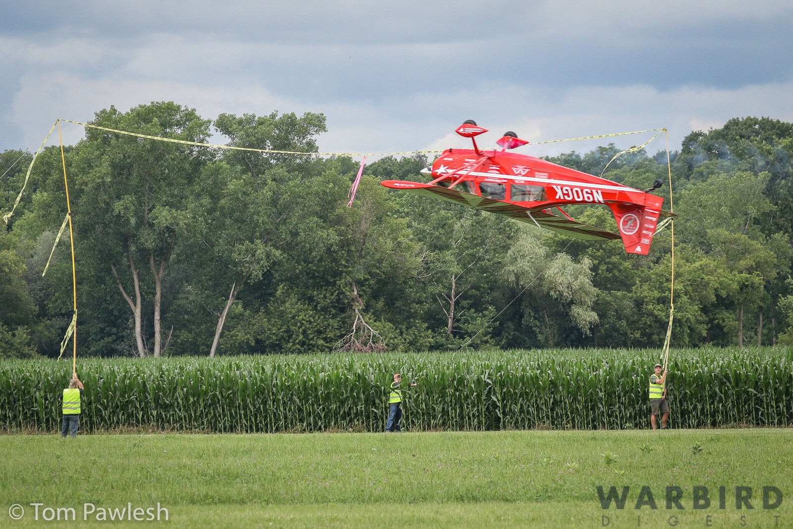 Greg Koontz preparing for an inverted ribbon cut in his American Champion 8KCAB Super Decathalon at Geneseo. (photo by Tom Pawlesh)