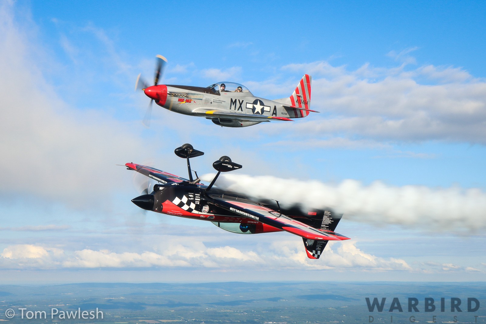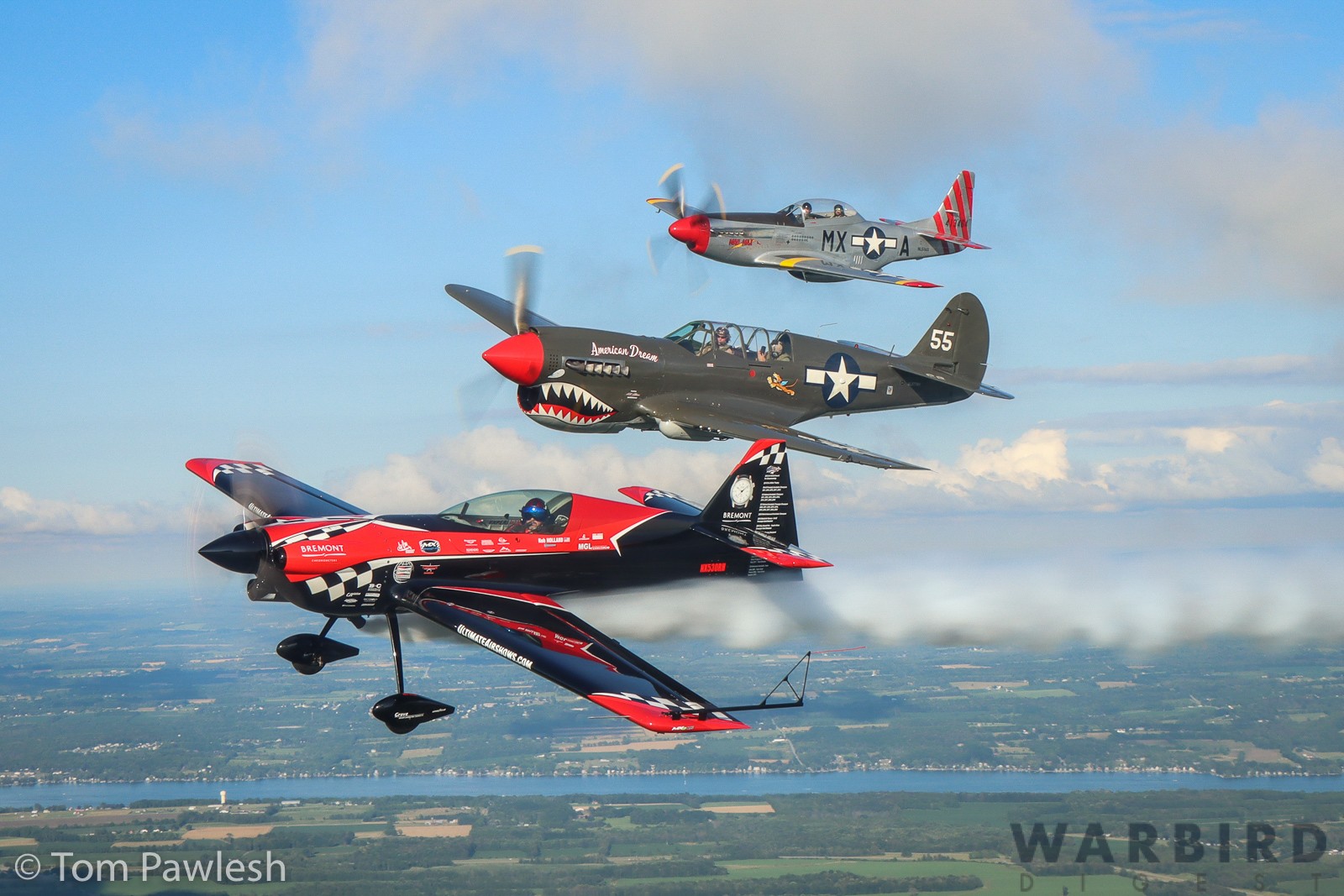 Just the warbirds – Thom Richard in his P-40N ‘American Dream’ with Lou Horschel in his TP-51D ‘Mad Max’ flying high over Geneseo during the weekend of ‘The Greatest Show on Turf’. (photo by Tom Pawlesh)