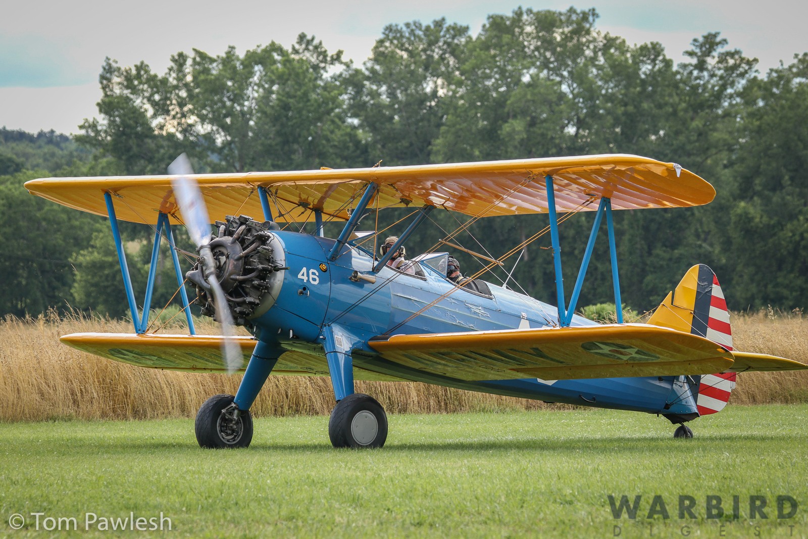 Quentin Marty’s beautiful Boeing N2S-2 Kaydet (BuNo.3600) takes to the skies from Geneseo’s grass airstrip. (photo by Tom Pawlesh)