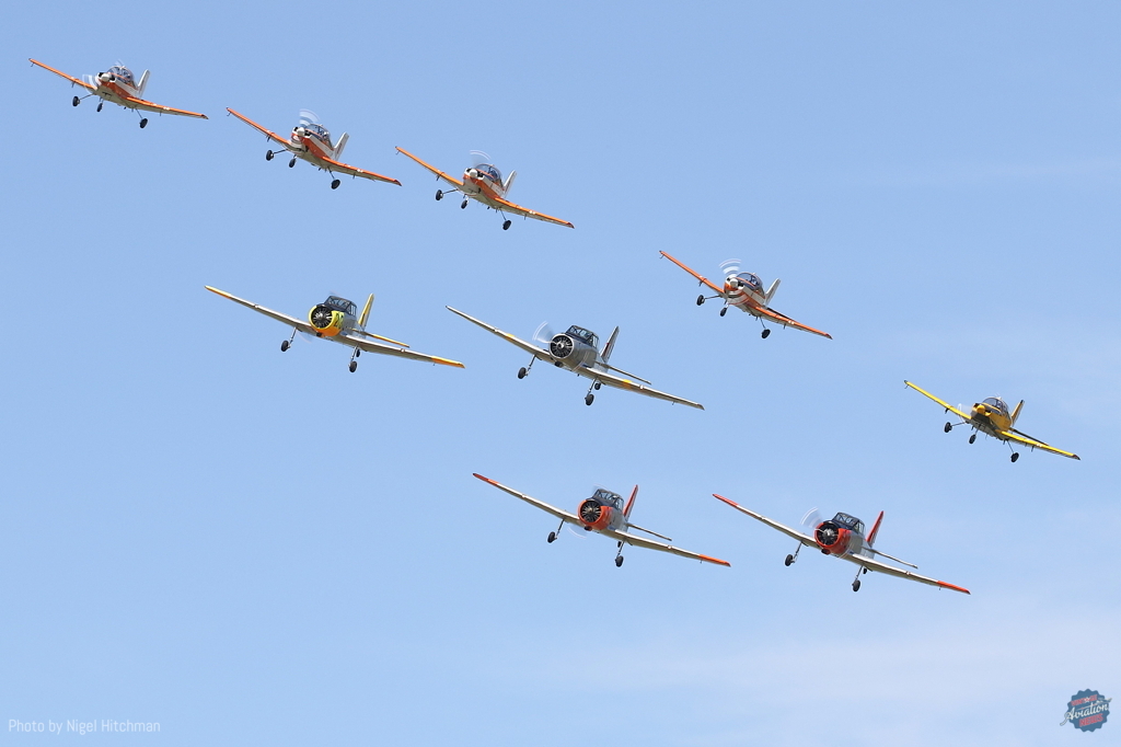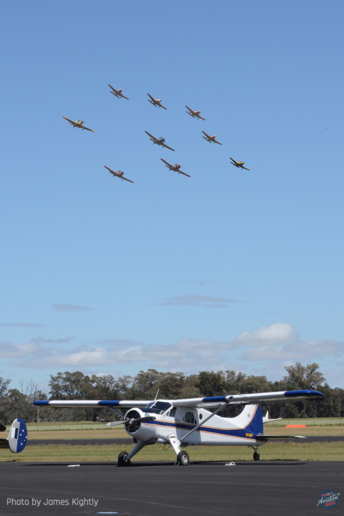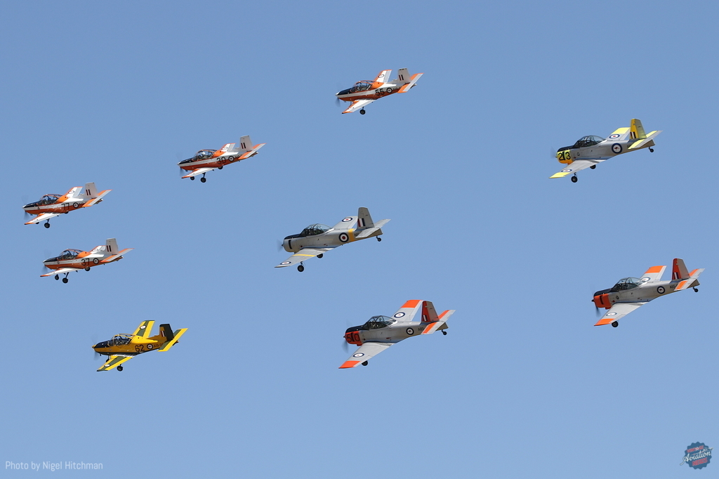 The civil originated trainer formation first displayed at Warbirds Downunder 2011, and usually fielded seven Winjeels and CT-4s or (as here) has step up to nine of the two types, with additional solo aerobatic demonstrations: this show’s display having a CT-4 solo from Queensland based Matt Denning, and Winjeel presented by team lead Matt Henderson.