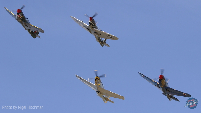 The show opened with the Australian National Anthem, and then featured four V12 powered WWII fighters (as seen in the header image); the local Spitfire Mk.VIII, VH-HET, of 100 Squadron, RAAF, Old Aeroplane Co Curtiss P-40F, VH-HWK, from Tyabb, Mustang VH-LUI from Precision aerospace, Wangaratta, both Victoria, and P-40E VH-KTY from Pay’s Aviation, NSW, flown by Paul Bennet.