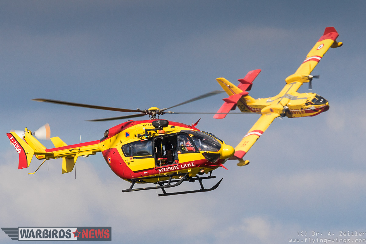 Nevertheless the locally-based Amicale Jean Baptiste Salis collection came up with a diversified flying program from 1pm until well after half past six on Saturday. It spanned the whole history of flight, from the early days of Blériot up to modern military jets. There was a strong participation from the Securité Civile and the French military, which usually uses the La Ferté air show to open the new season for the Patrouille de France and the Rafale jet fighter solo display. A fly-by of a Corsair International Boeing 747 Jumbo Jet celebrated the airline’s 35th anniversary and 100 years of the American aircraft manufacturer. This reflected upon the legendary airliner displays at the airfield during the 1980s, such as the Concorde fly-by in this video VIDEO HERE TO POST AFTER though present day regulations prevent them flying so close to the public. With an interesting contrast in scale, a Boeing Stearman flew just after the Jumbo had cleared the scene and left behind a fascinated crowd.