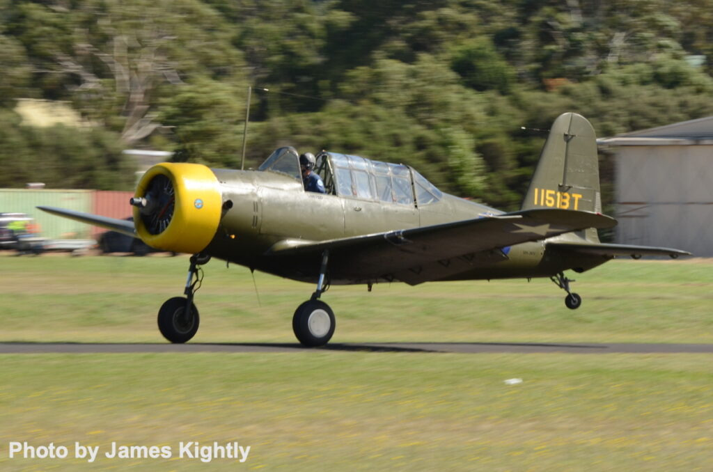 Rare in Australia, the Vultee BT-13 trainer is displayed by Luke Kempton. [Photo by James Kightly]