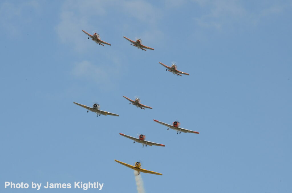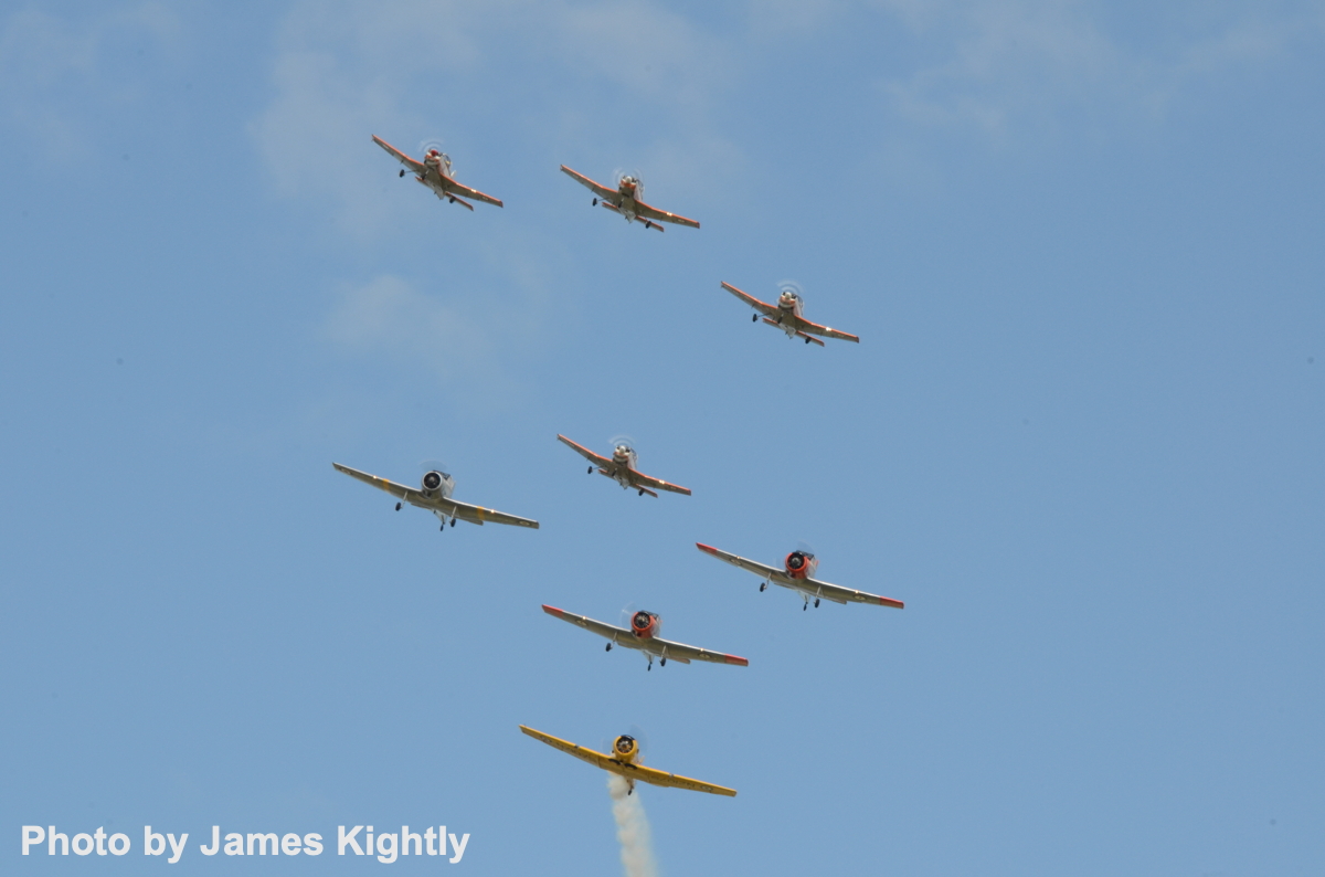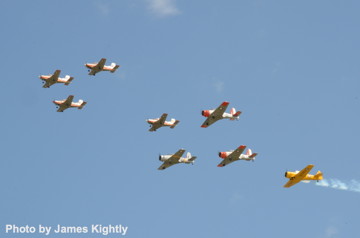 A mix of air force heritage aircraft and private owner types, the ‘Heritage Trainers’ have managed up to nine aircraft in formation, or as on this weekend … [Photo by James Kightly]