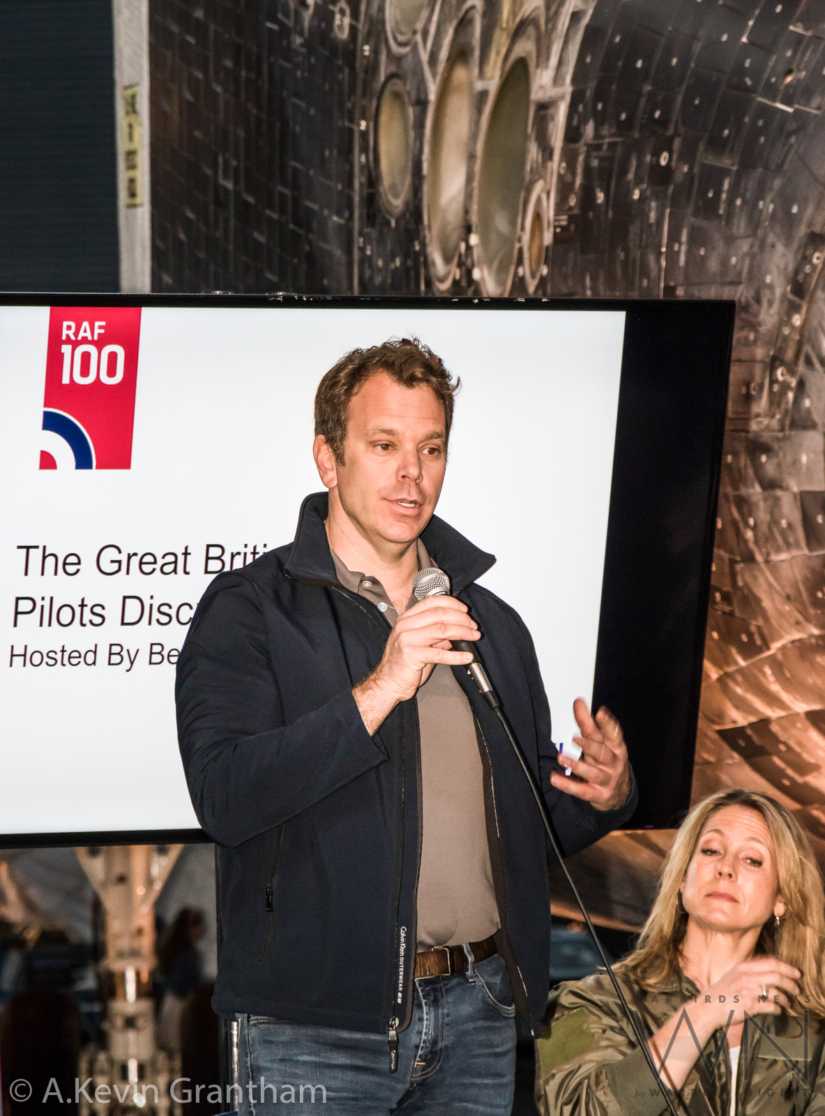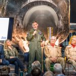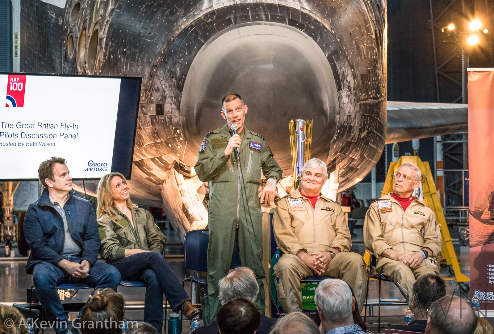 Group Captain Willy Hackett, one of the RAF pilots who took part in the Lockheed F-35B Lightning II test flying program, talks about his experiences to the crowd. Other members on the stage, from left to right, include Rob Collings of the Collings Foundation, Heather Penney, and Dave Rohrer and Leon Evans of the Canadian Warplane Heritage Museum. (photo by A.Kevin Grantham)