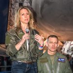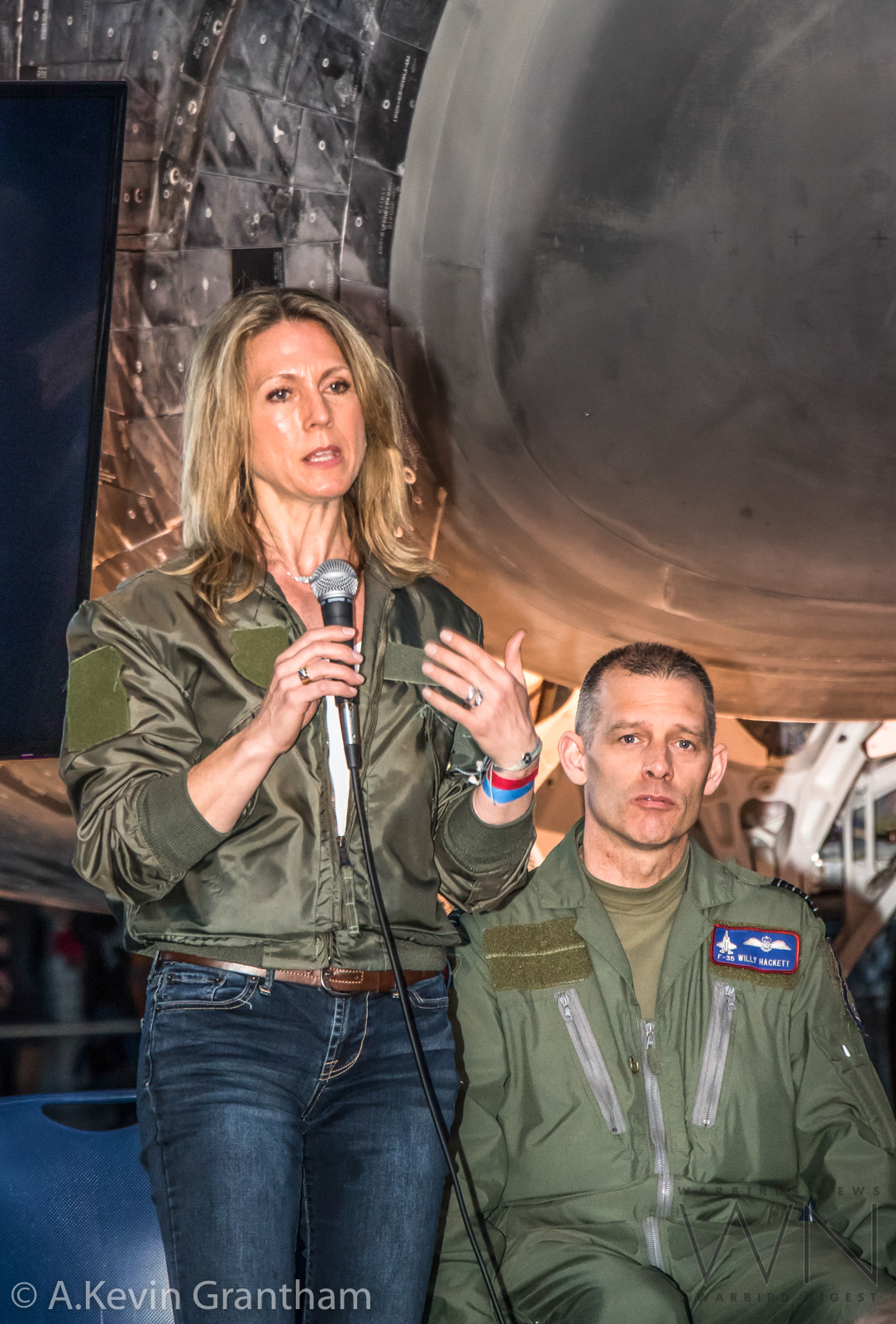 Former USAF Lt. Heather Penney speaks before the crowd during the lecture at the Great British Fly-in. Penney became famous for her role on 9-11 when she and another pilot were tasked with ramming UAL Flight 93, if they had to, in order to prevent it from approaching Washington, DC. She is currently Director of U.S. Air Force Air Superiority at Lockheed-Martin and specializes in the F-35 program. (photo by A.Kevin Grantham)