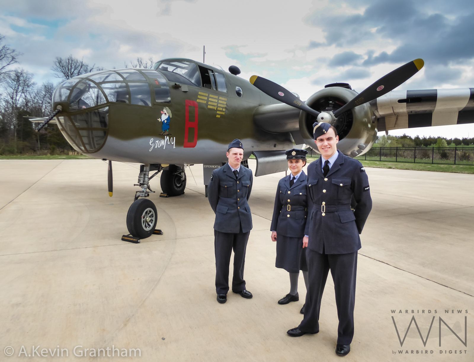 RAF re-enactors standing beside the Historic Flight Museum’s B-25D Grumpy. (photo by A.Kevin Grantham)