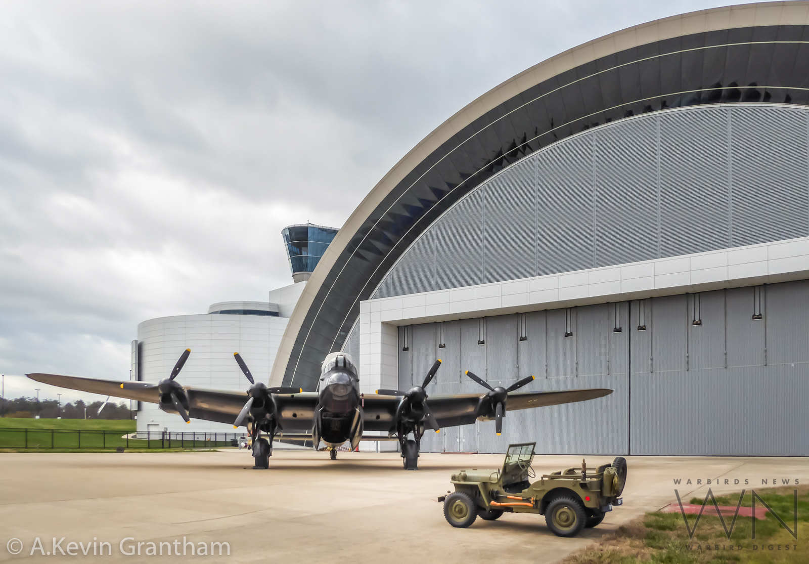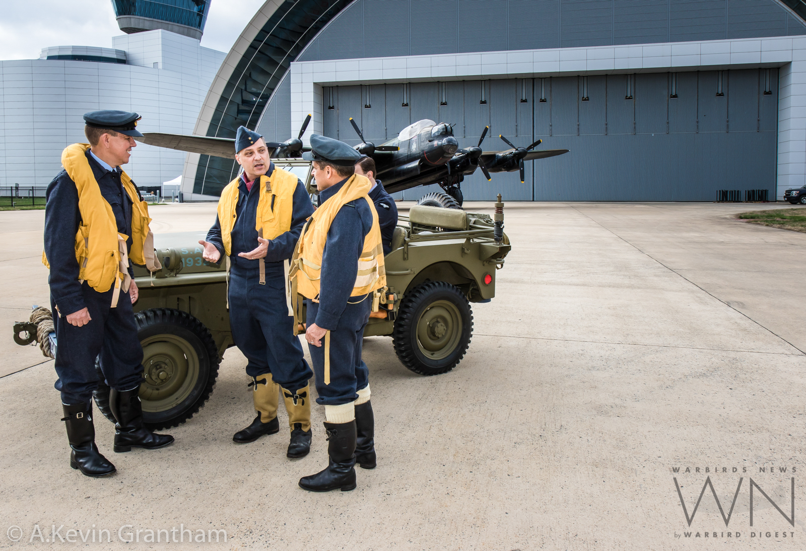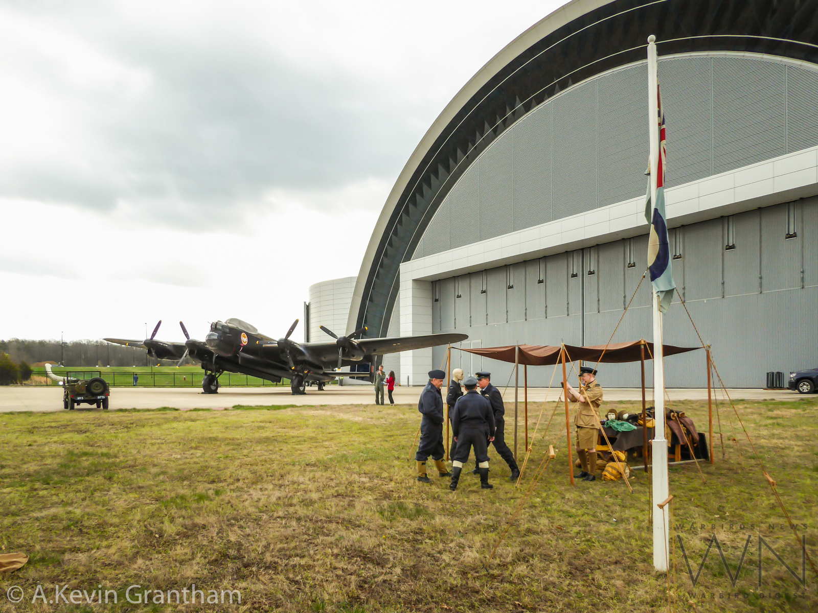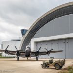 The Lancaster continues her march towards the Udvar-Hazy Center. (photo by A.Kevin Grantham)RAF re-enactors posing beside a jeep with the Canadian Warplane Heritage Museum’s Avro Lancaster B.X FM213 standing in the background beside the Udvar-Hazy Center. (photo by A.Kevin Grantham)
