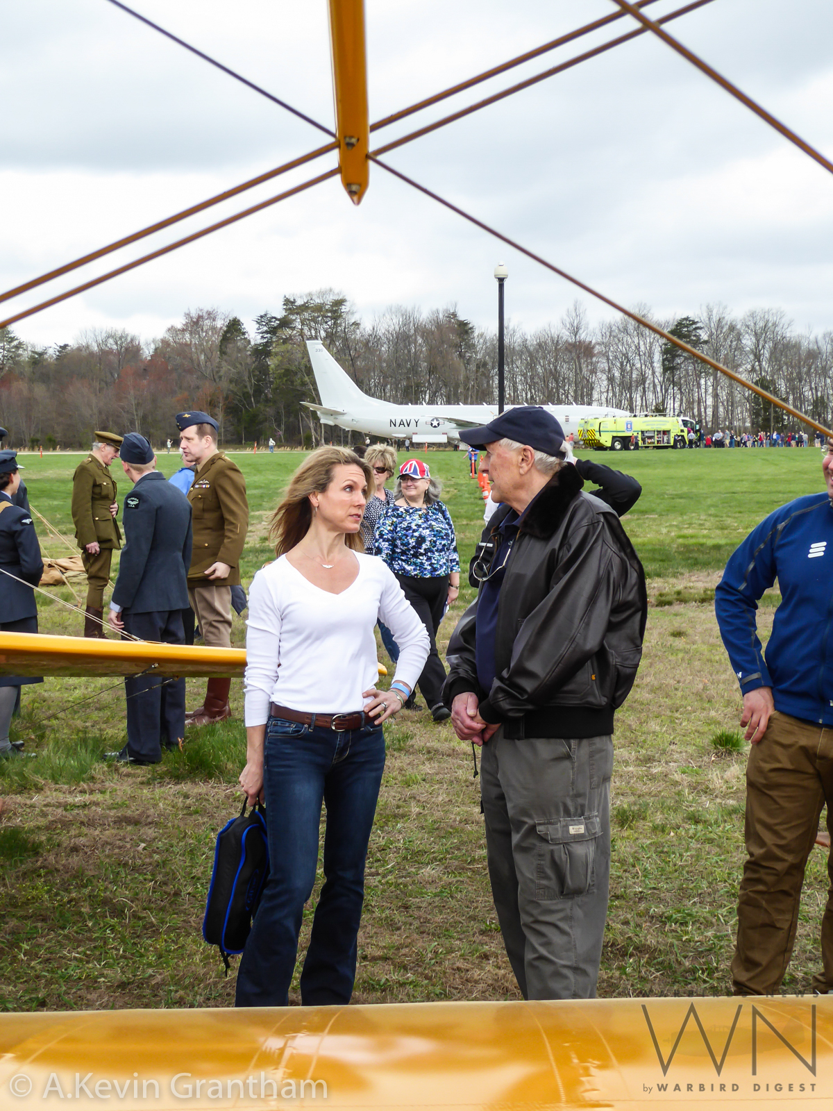 Some of the crowd and participants at the Great British Fly-in framed against the flying wires of a deHavilland Chipmunk. A U.S. Navy P-8 Poseidon is visible in the background, a type which will be entering RAF service in the near future (photo by A.Kevin Grantham)