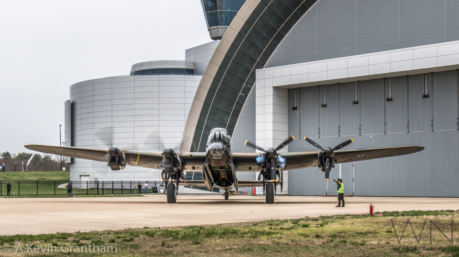 The Canadian Warplane Heritage Museum’s Avro Lancaster starting up her engines outside the National Air & Space Museum’s Steven F. Udvar-Hazy Center. (photo by A.Kevin Grantham)