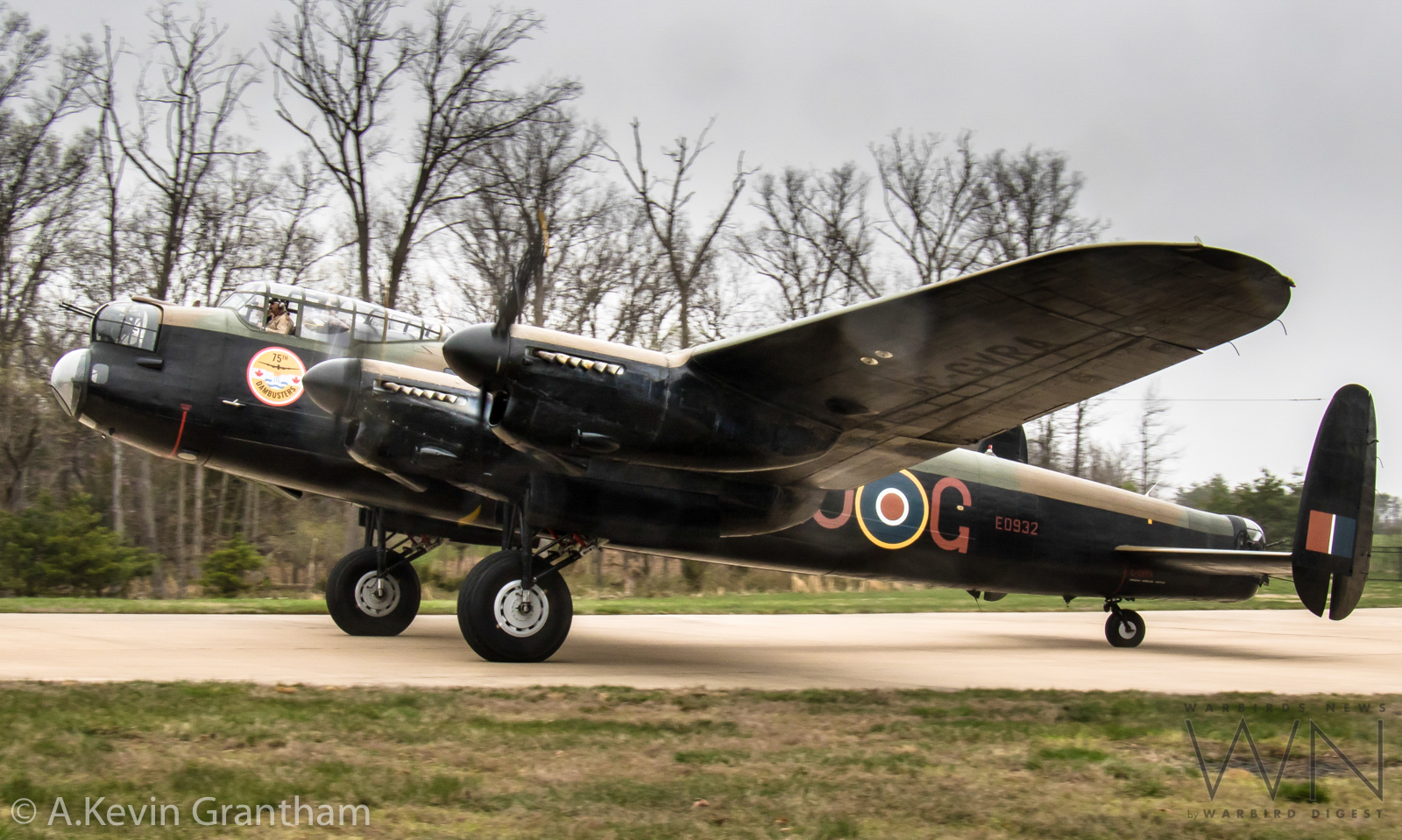 A glorious shot of the Canadian Warplane Heritage Museum's Avro Lancaster shortly after arriving at the Smithsonian's Steven F. Udvar-Hazy Center in preparation for the Great British Fly-in celebrating the RAF's Centenary on the following day. Note the large yellow decal just below the cockpit. It is honoring the 75th anniversary of the famous Dambuster raid of May 16/17th 1943. (photo by A.Kevin Grantham)
