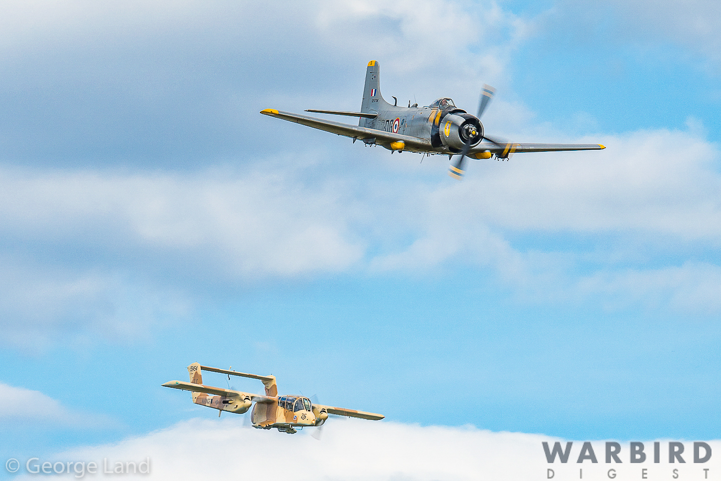 Douglas AD-4N Skyraider, F-AZFN, Bu.125716 22-DG, (Bernard Vurpillot) and North American-Rockwell OV-10B Bronco, F-AZKM, 55454 Marines-26 VMO-2, Da Nang AB Vietnam, built as Bu.158030-Luftwaffe 99+24 (Alain Bes). (photo by George Land)