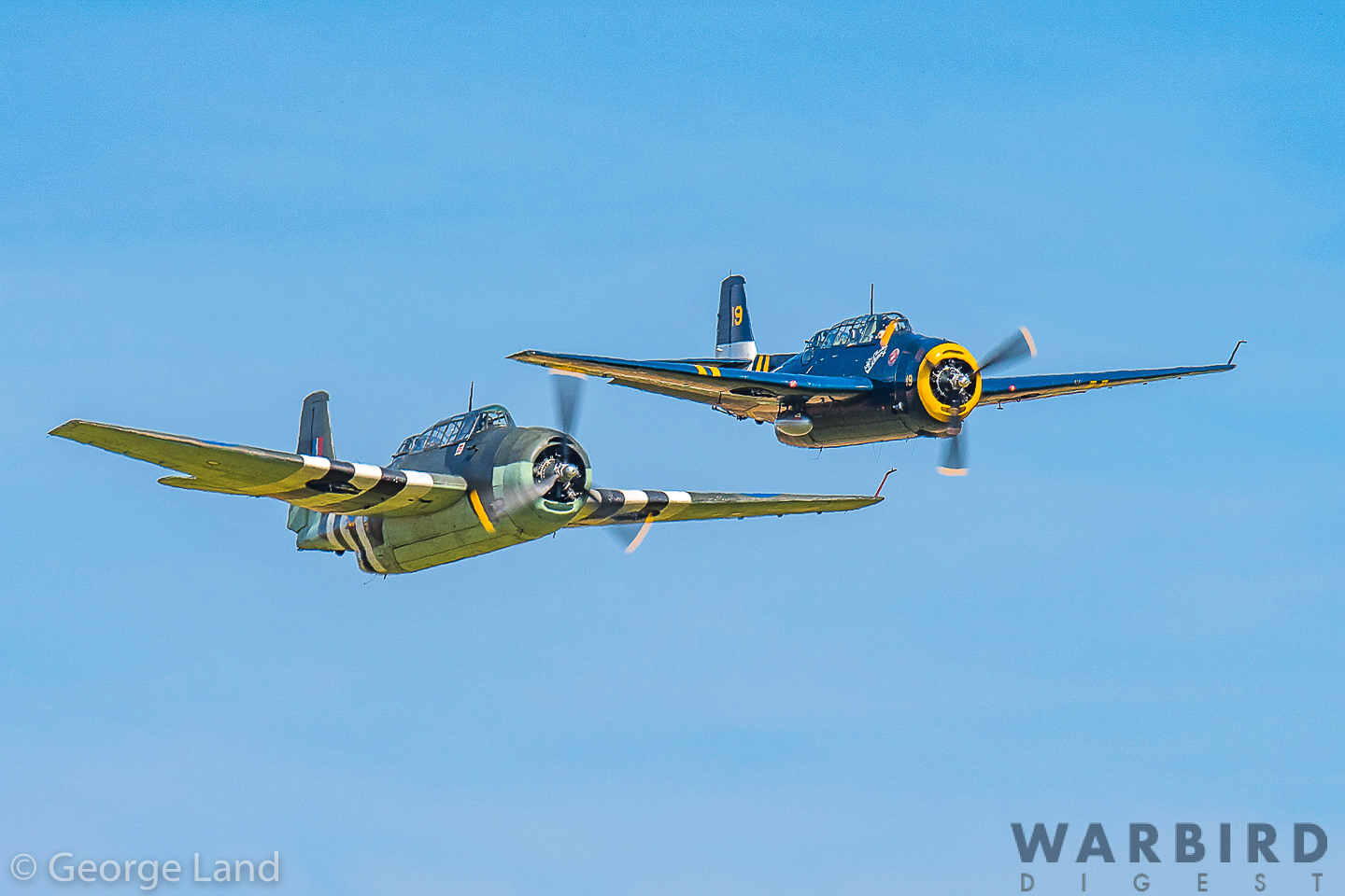 Grumman/General Motors TBM-3E(R) Avenger, F-AZJA, Bu.85869, IN the colors of the Royal Navy-Fleet Air Arm (pilot Didier Chable) Grumman/General Motors TBM-3(R) Avenger, HB-RDG, Bu.53319 USMC-19, “Charlie’s Heavy”. (photo by George Land)