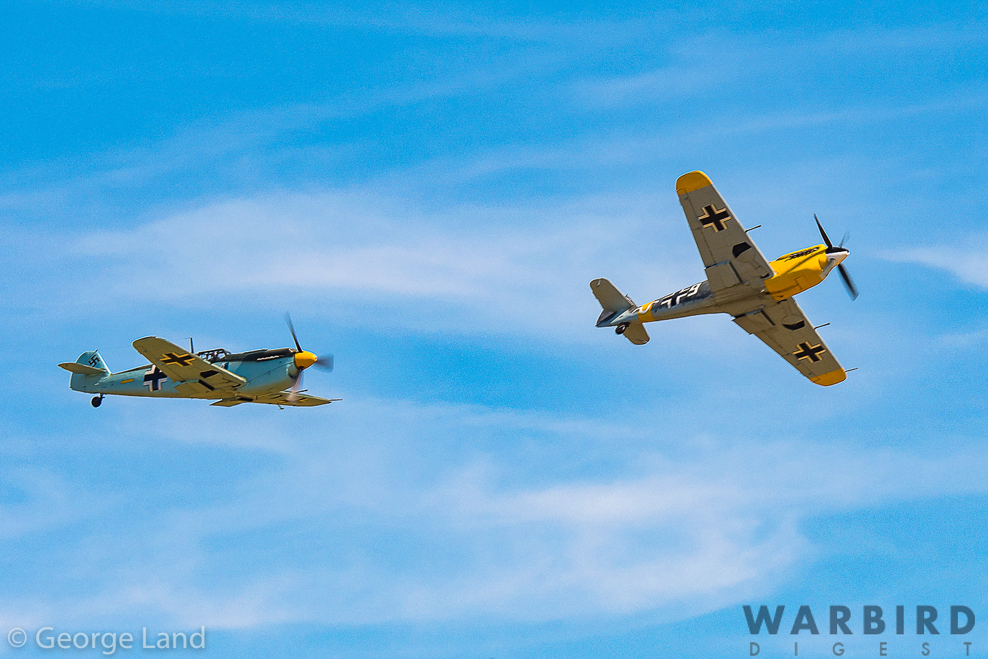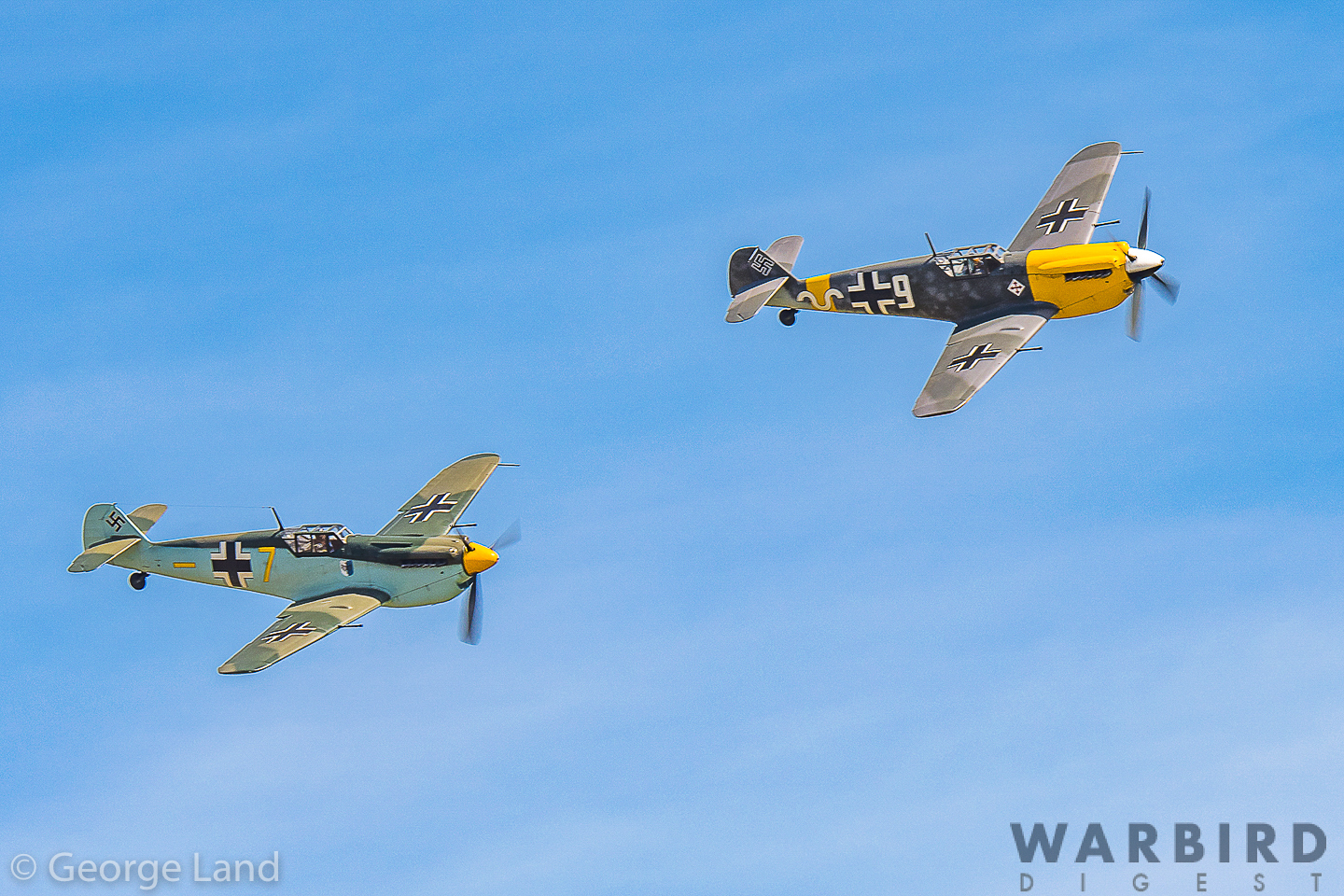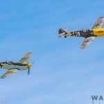 Hispano Buchon HA-1112-M1L (Bf109), C.4K-105, s/n145, White 9, G-AWHH, (Richard Grace), Hispano Buchon HA-1112-M1L (Bf109), C.4K-99, Yellow 7, G-AWHM (Dave Puleston). (photo by George Land)