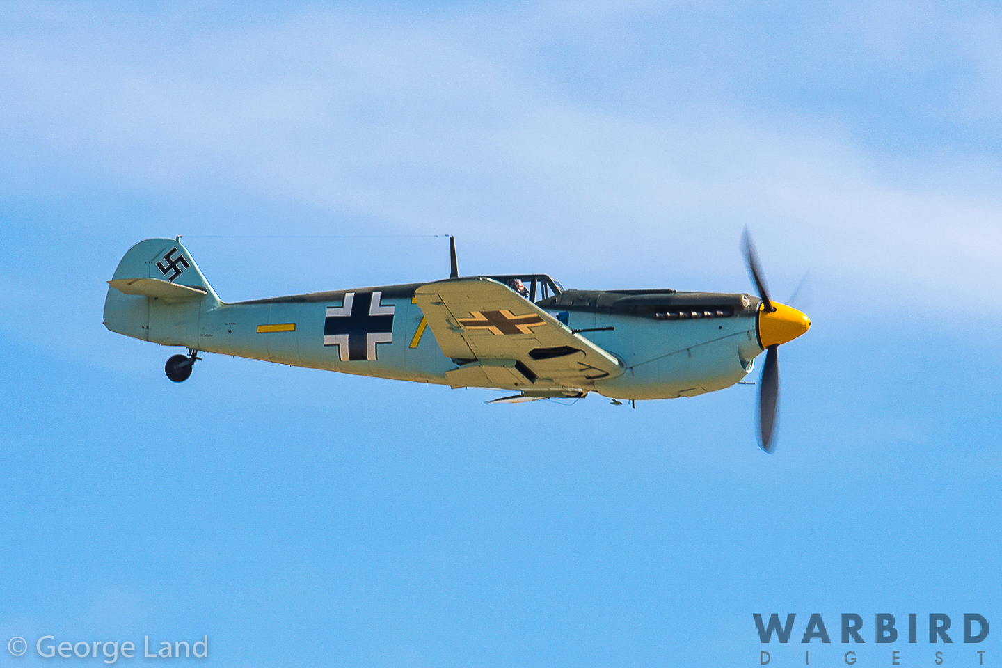 Hispano Buchon HA-1112-M1L (Bf 109), C.4K-99, Yellow 7, G-AWHM (pilot Dave Puleston). (photo by George Land)