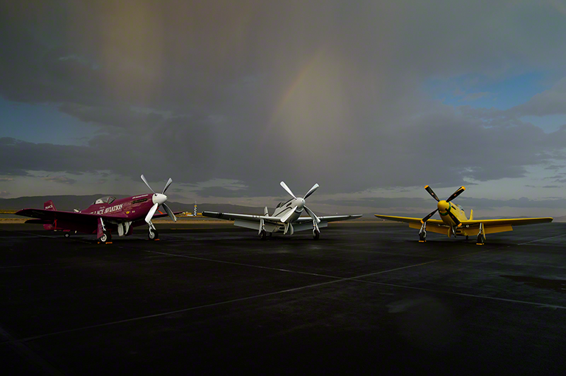 The day ended with a tremendous thunderstorm clearing the field. We were just setting up an evening’s shooting with John Bagley’s Ol Yeller, John D’Alessandris #15 and Clay Lacey’s Ms Van Nuys. These three aircraft raced in the 1964 Reno Air Races, the first one. Well as you can see, the thunderstorm found us. Sending nearly all for cover, the sun broke through to bring a rainbow over home pylon.