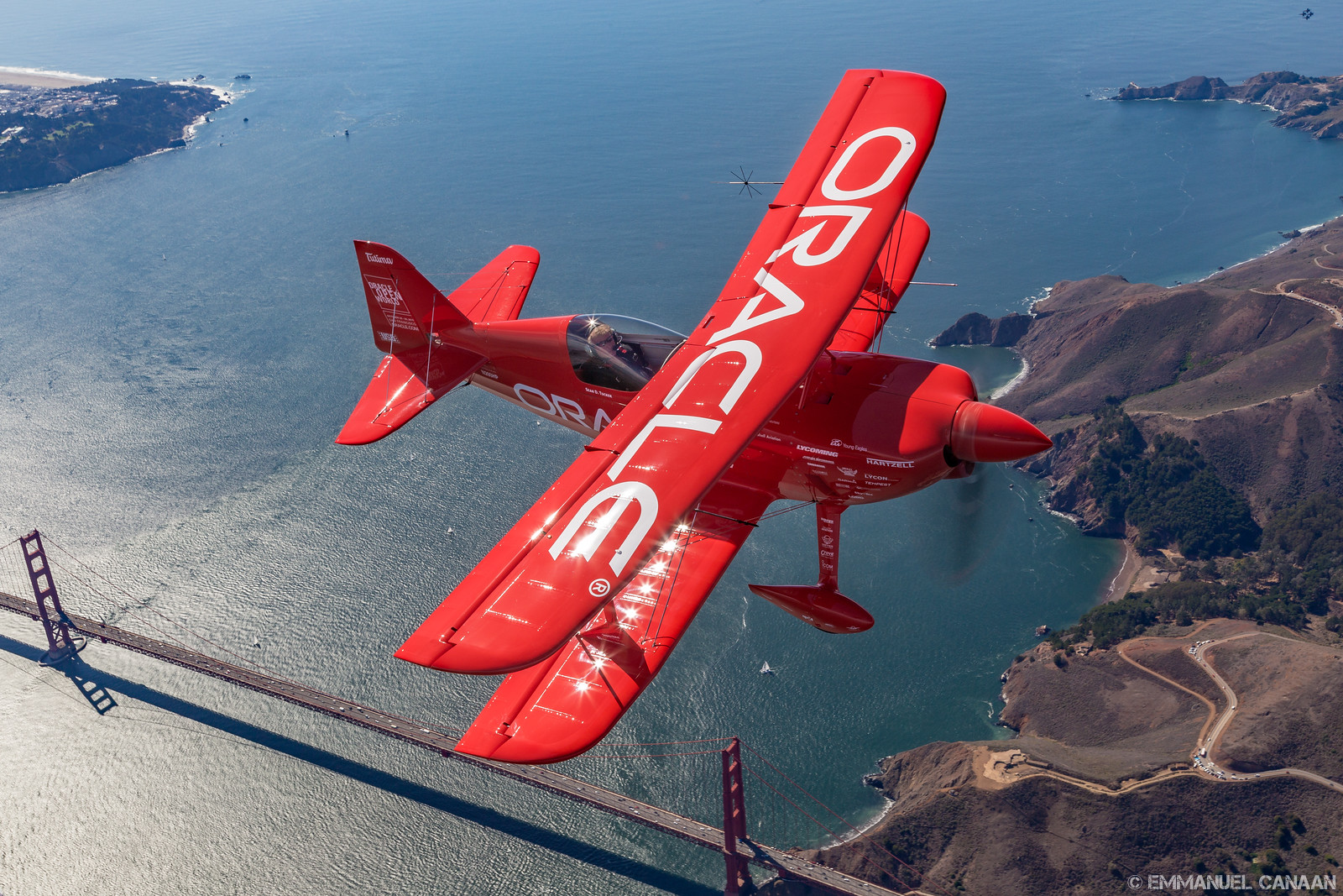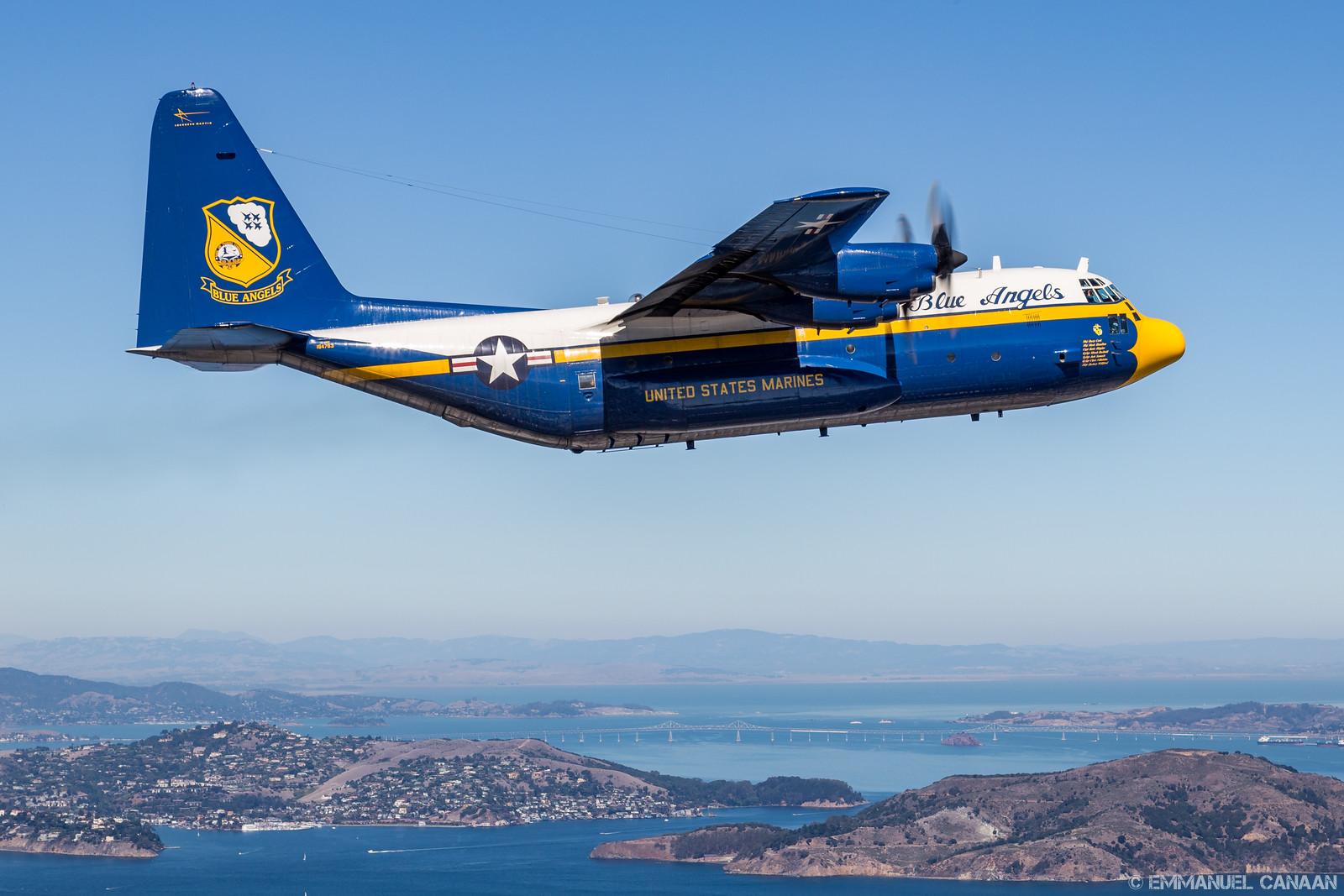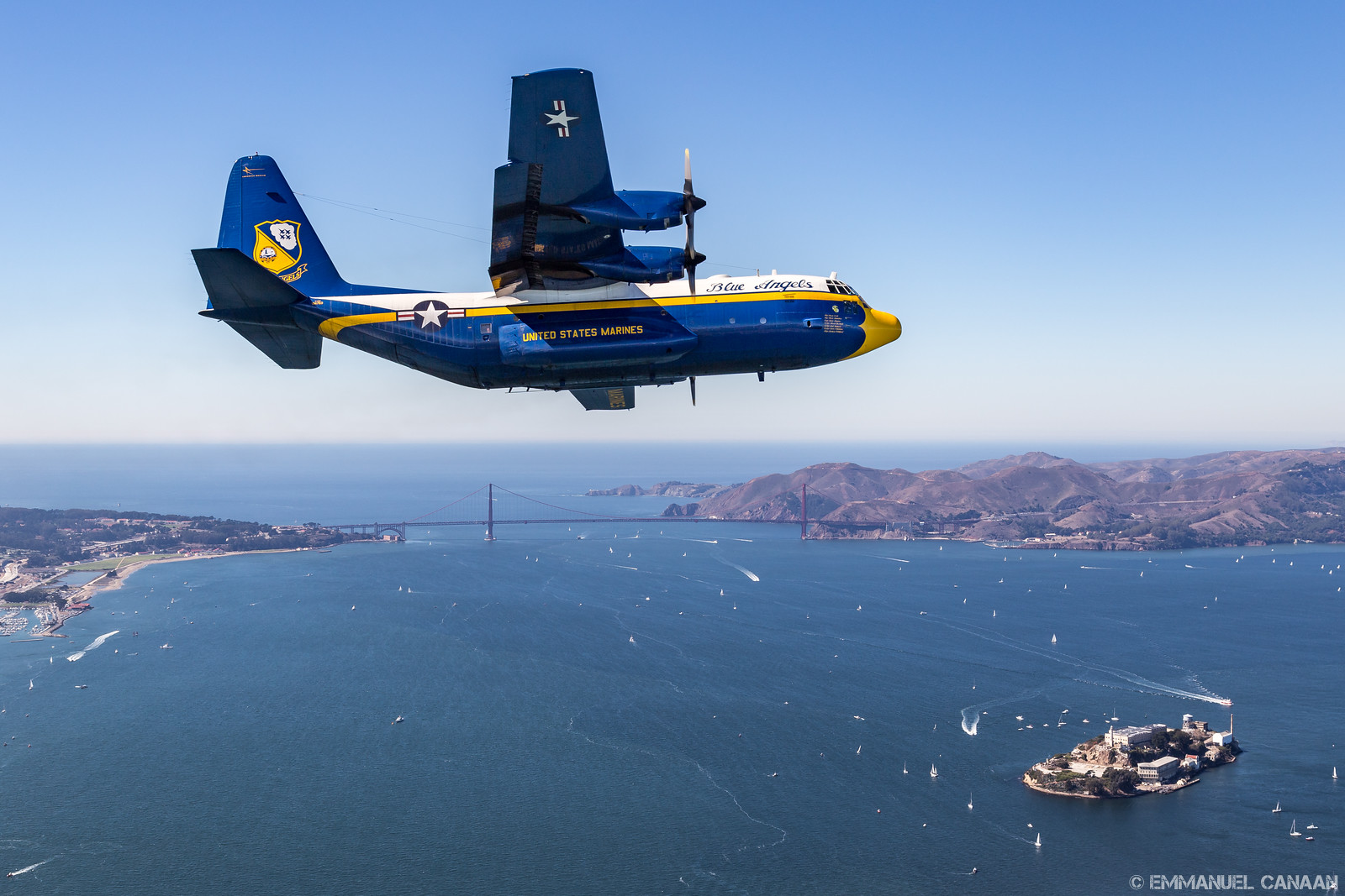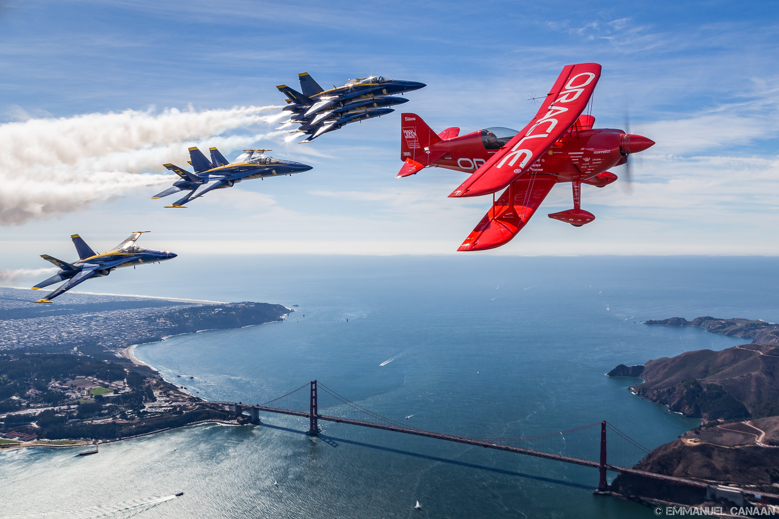 WarbirdsNews loves to promote the work of talented photographers, and we are overjoyed to share the stunning work of Emmanuel Canaan here for you today. During Fleet Week 2015 in San Francisco, California, Canaan had the rare opportunity to go up for an air-to-air photoshoot with the US Navy’s Blue Angels flight demonstration team flying in formation with probably the world’s finest aerobatics pilot, Sean D. Tucker. They had a stunning backdrop in the scenery around San Francisco Bay area to play with … including the Golden Gate Bridge and the infamous Alcatraz Island. Needless to say, Canaan captured some magic with his lens, and we know you will enjoy the results. We will let him continue the conversation in his own words…