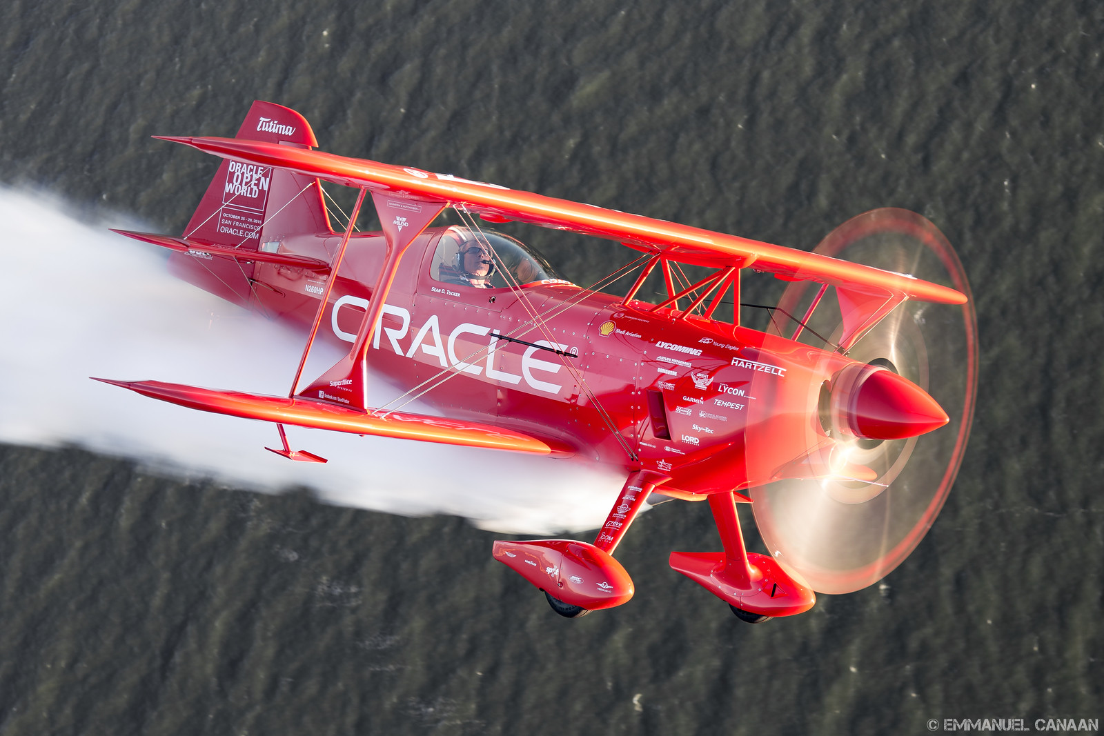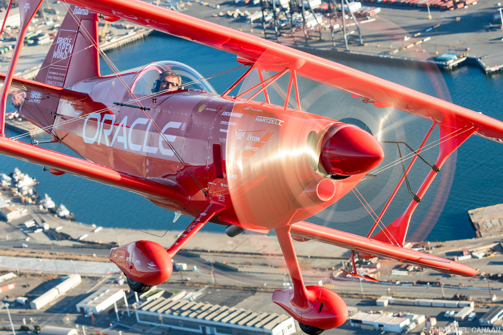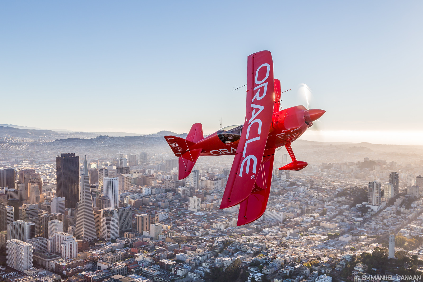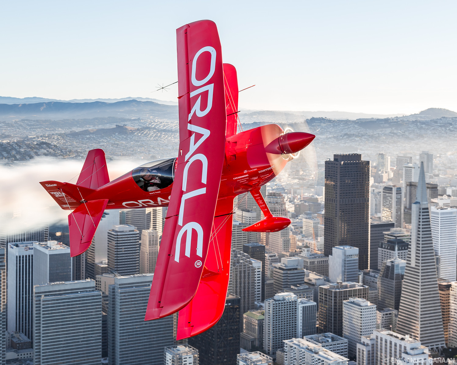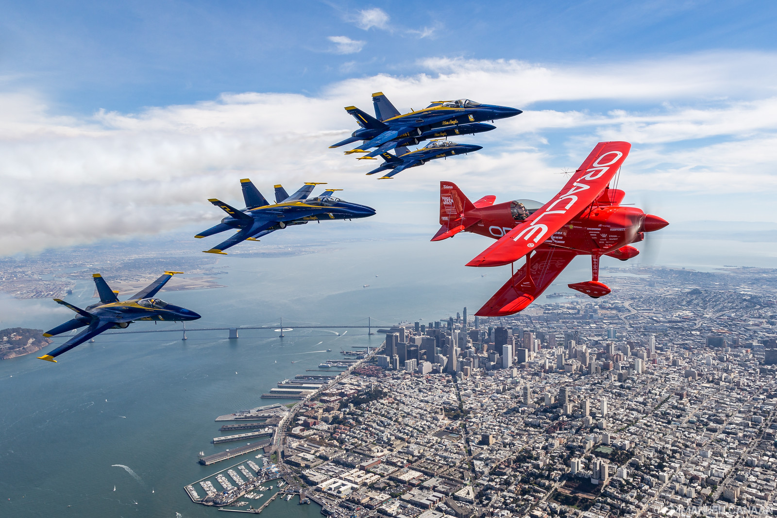 WarbirdsNews loves to promote the work of talented photographers, and we are overjoyed to share the stunning work of Emmanuel Canaan here for you today. During Fleet Week 2015 in San Francisco, California, Canaan had the rare opportunity to go up for an air-to-air photoshoot with the US Navy’s Blue Angels flight demonstration team flying in formation with probably the world’s finest aerobatics pilot, Sean D. Tucker. They had a stunning backdrop in the scenery around San Francisco Bay area to play with … including the Golden Gate Bridge and the infamous Alcatraz Island. Needless to say, Canaan captured some magic with his lens, and we know you will enjoy the results. We will let him continue the conversation in his own words…