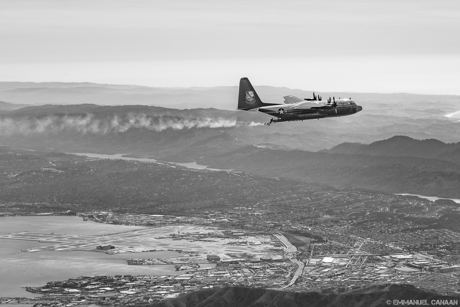 The excitement continued the following day when I was able to go up again with the Blue Angels support aircraft, the famous C-130 Hercules known familiarly as ‘Fat Albert’. That flight had a very similar briefing to the day before in terms of content, but was more intimate as we (including a photographer from the Blue Angels) stood outside in the shadow of Fat Albert with the first female Blue Angel and Fat Albert’s pilot, Captain Katie Higgins to discuss the flight details. We had a unique photo-ship pilot for the Fat Albert flight. Sean D. Tucker himself took the reins of the Seneca! It was also quite different in the pacing as we had much more time to orbit the city at around 3,000ft with ‘Bert off our left wing before the (relatively) leisurely climb to 8,000ft to drop the U.S. Navy Parachute team “The Leap Frogs” for the start of the Friday Fleet Week air show. For the parachute drop, it was a mighty struggle for position as we had to be farther out and behind Fat Albert to catch a safe view of the open ramp, rather than close in and ahead like we usually are in a typical air-to-air photo-op.
