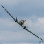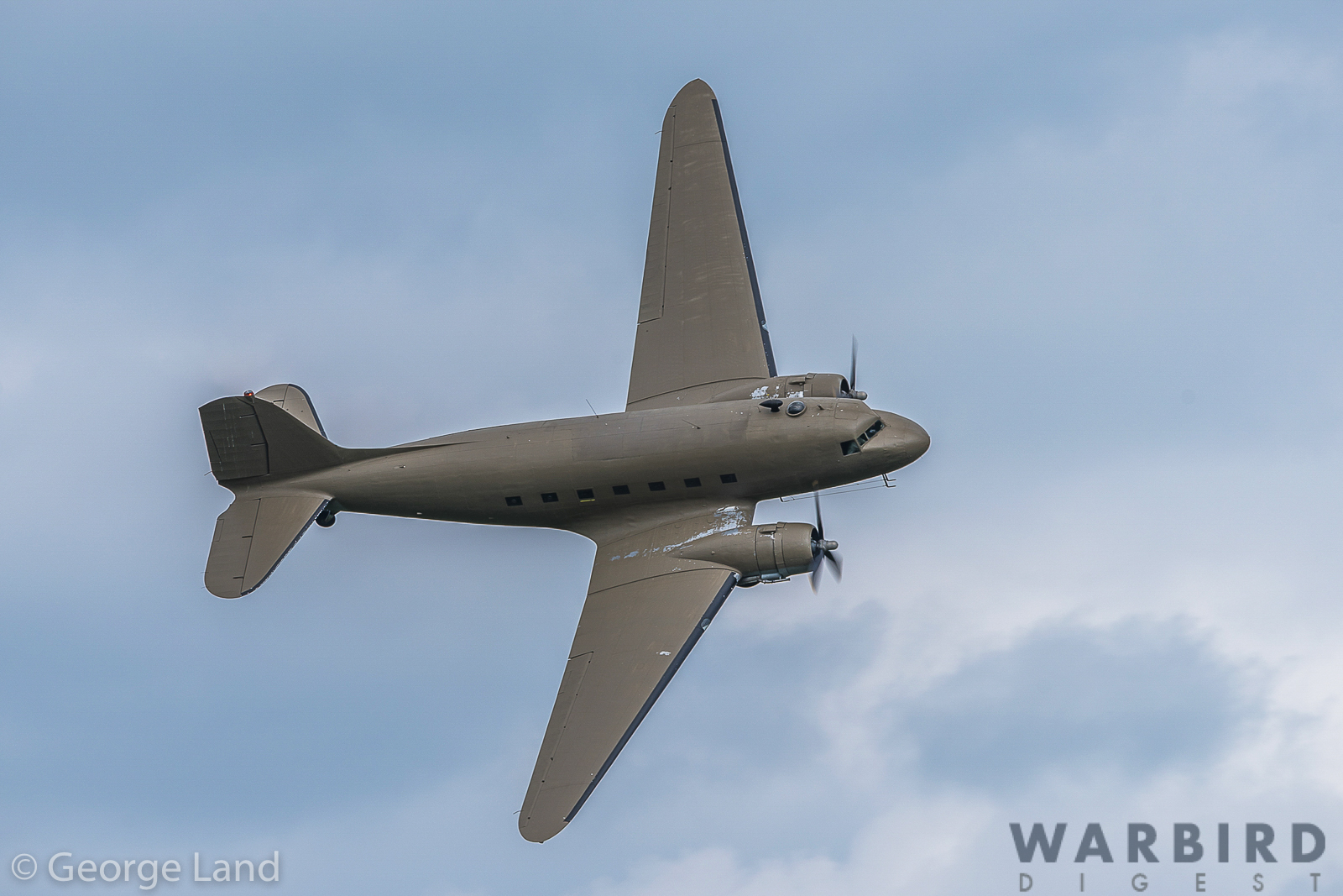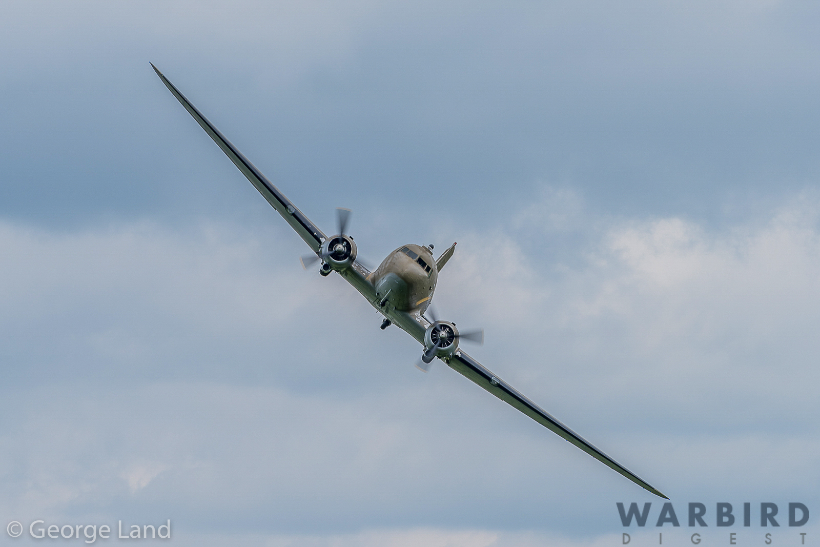 Aces High’s former RAF Douglas C-47A-75-DL Dakota 42-100884/TS423 over the Biggleswade as part of the Shuttleworth Collection’s recent air show. The aircraft as it is pictured here was part way through the process of being painted to represent ‘Mayfly’ a C-47 flown by the 79th TCS on D-Day. (photo by George Land)
