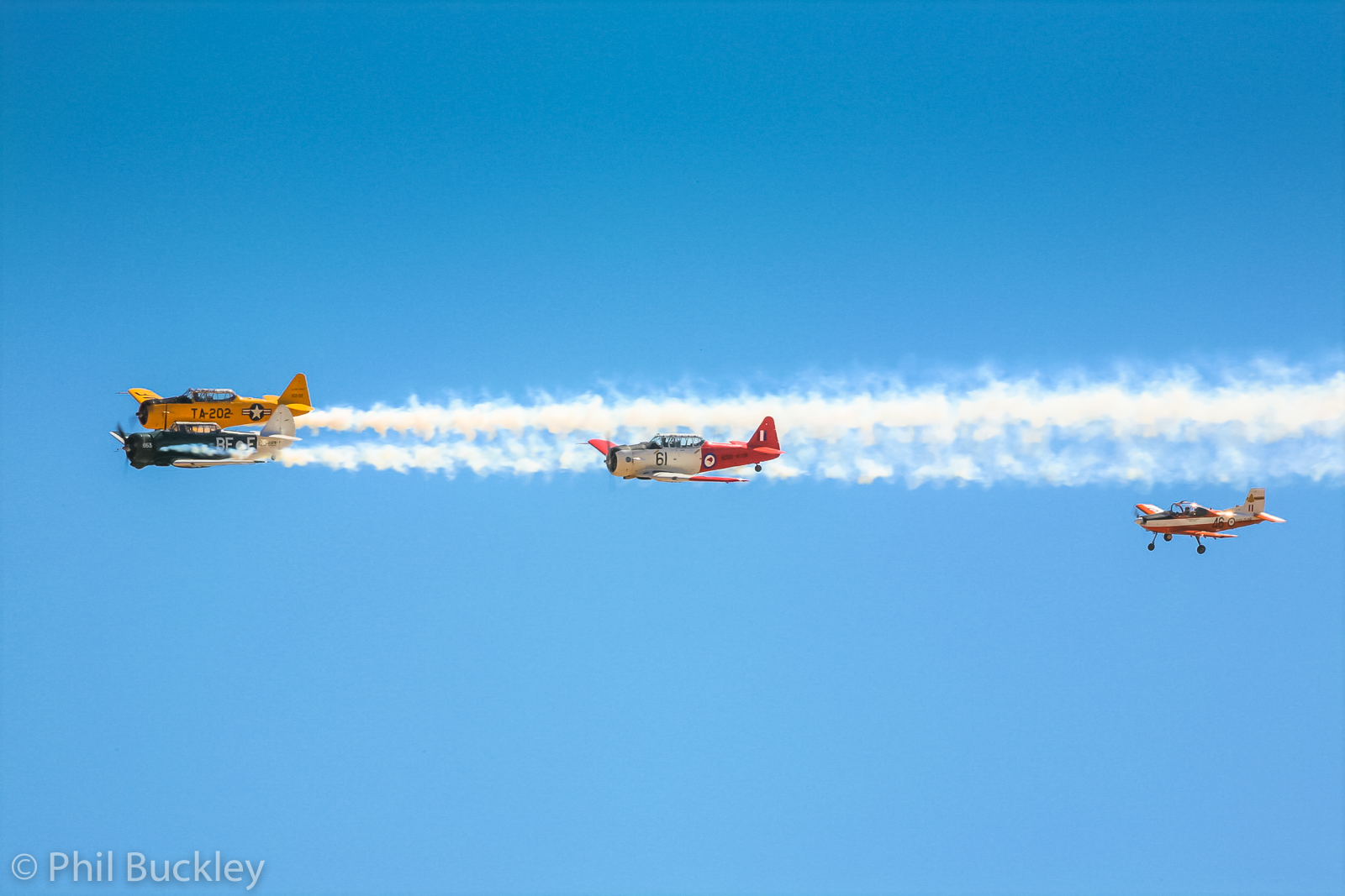 The Wirraway, Harvards and CT-4 during their formation fly-by. (photo by Phil Buckley)