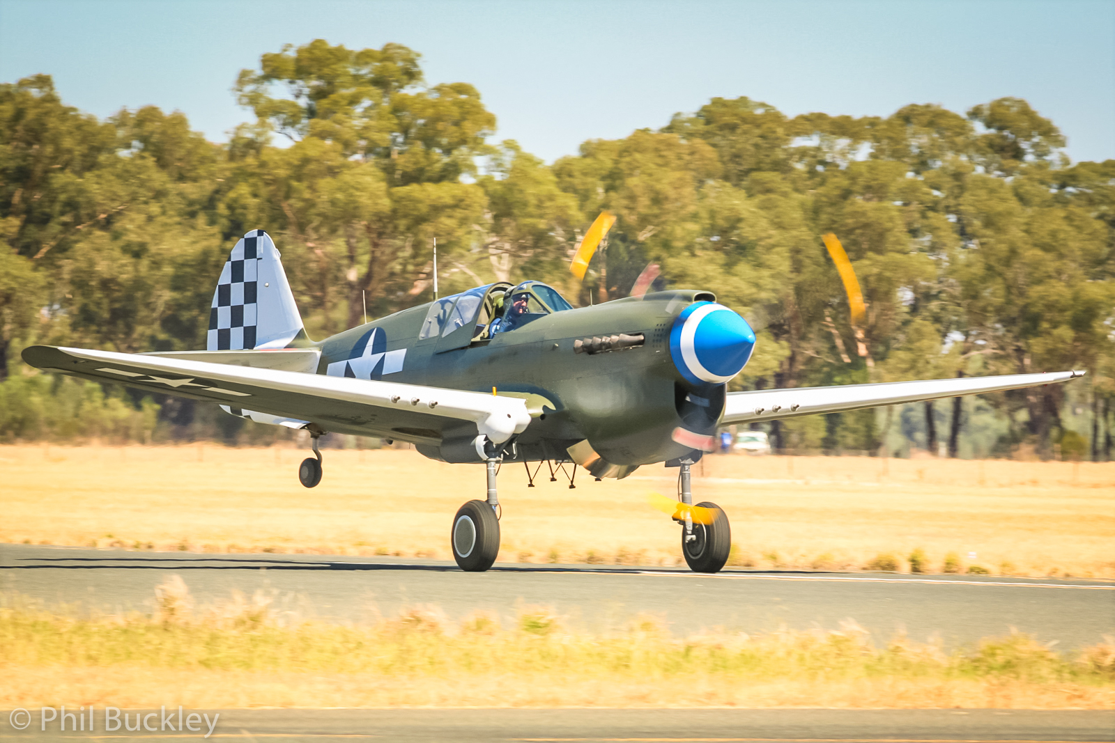 Doug Hamilton’s Curtiss P-40N during its takeoff run. (photo by Phil Buckley)