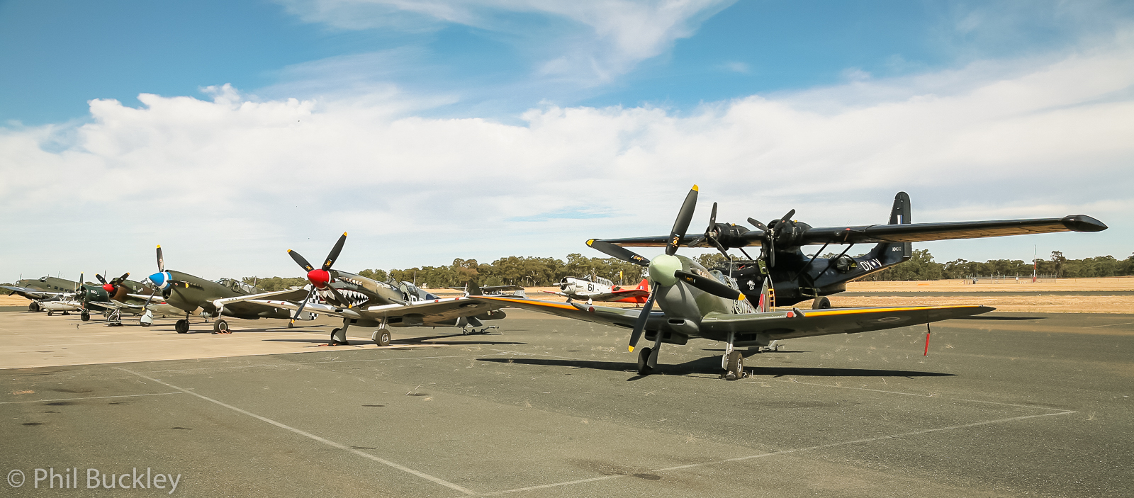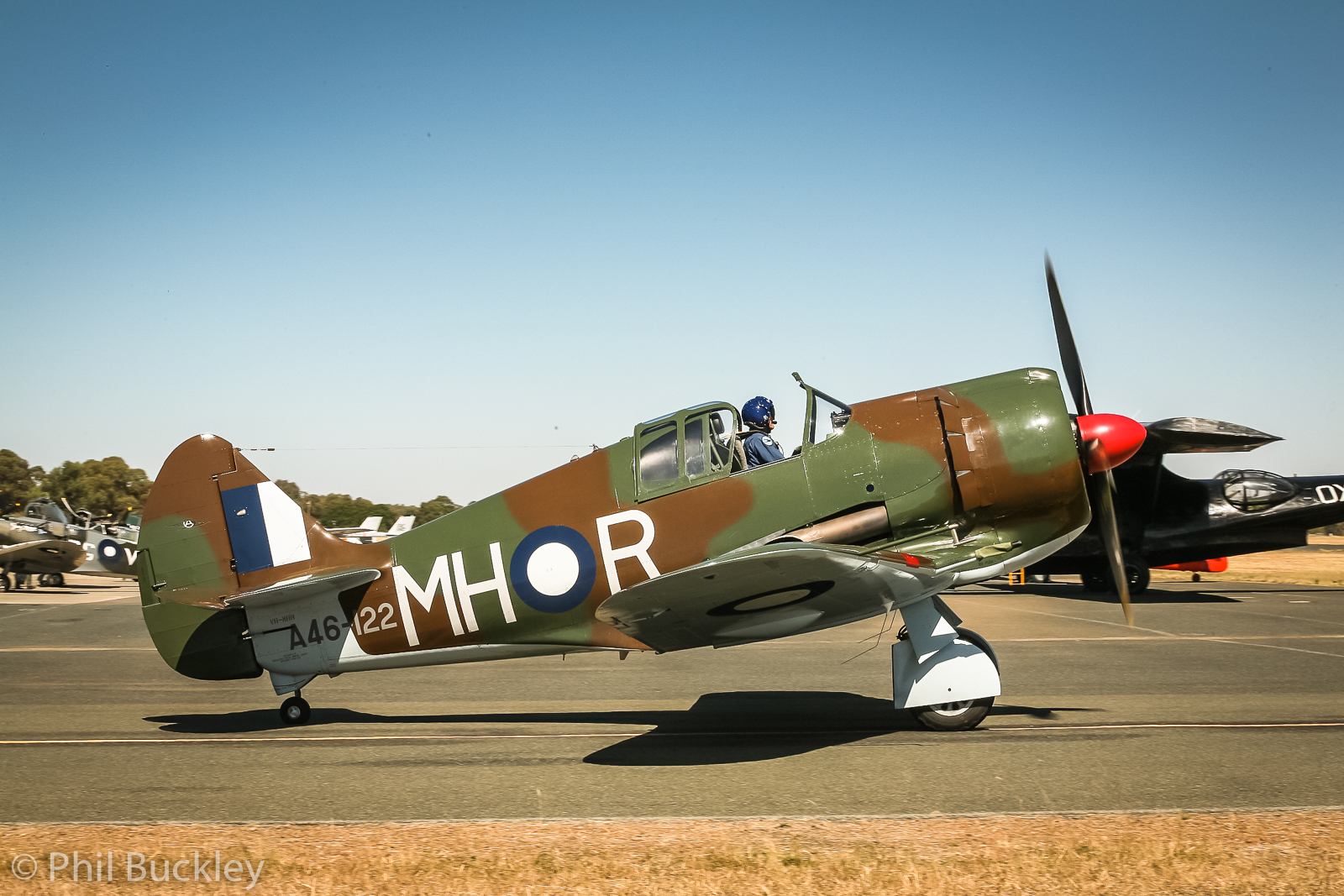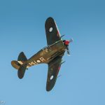 Doug Hamilton’s fabulous combat-veteran Curtiss P-40N Warhawk. This aircraft flew with the 49th FG . On Valentines Day, 1944, Lt. Nelson Flack was flying this Warhawk on a combat sweep out of Gusap Field on New Guinea. After successfully shooting down a Ki-61 Hein, Flack was forced to force-land his fighter due to a damaged engine cooling system. Although knocked unconscious in the crash-landing, and suffering a broken arm, Flack managed to get free of the Warhawk before it exploded. Flack was behind enemy lines, but was saved in a daring and complicatd rescue mission that is well described HERE. What remained of the P-40 lay where it fell until salvage in 2004. The restoration took place at Precision Aerospace in Wangaratta , Australia, and involves a lot of new-build material. (photo by Phil Buckley)