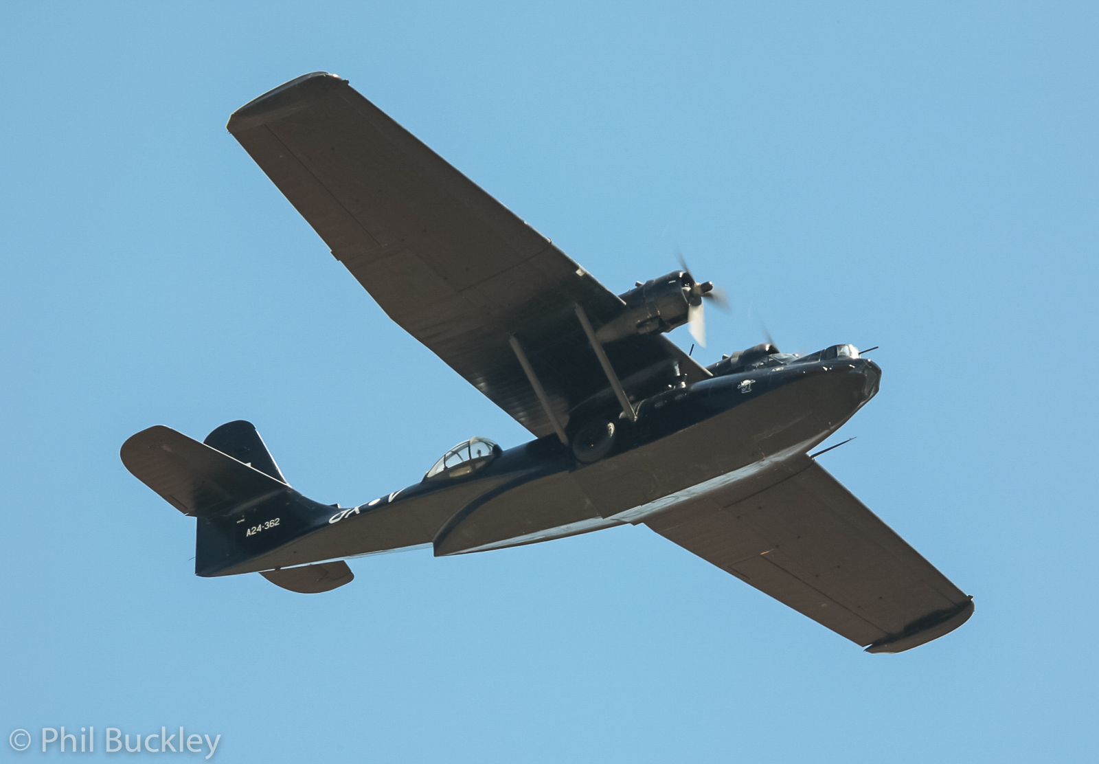 The HARS Catalina during its fly-by. While the aircraft is marked as a Boeing-built P2B-2, which flew in the RAAF as A24-362, it is actually PBY-6A Bu.46679 which saw service in the Aleutians during the last months of WWII. (photo by Phil Buckley)