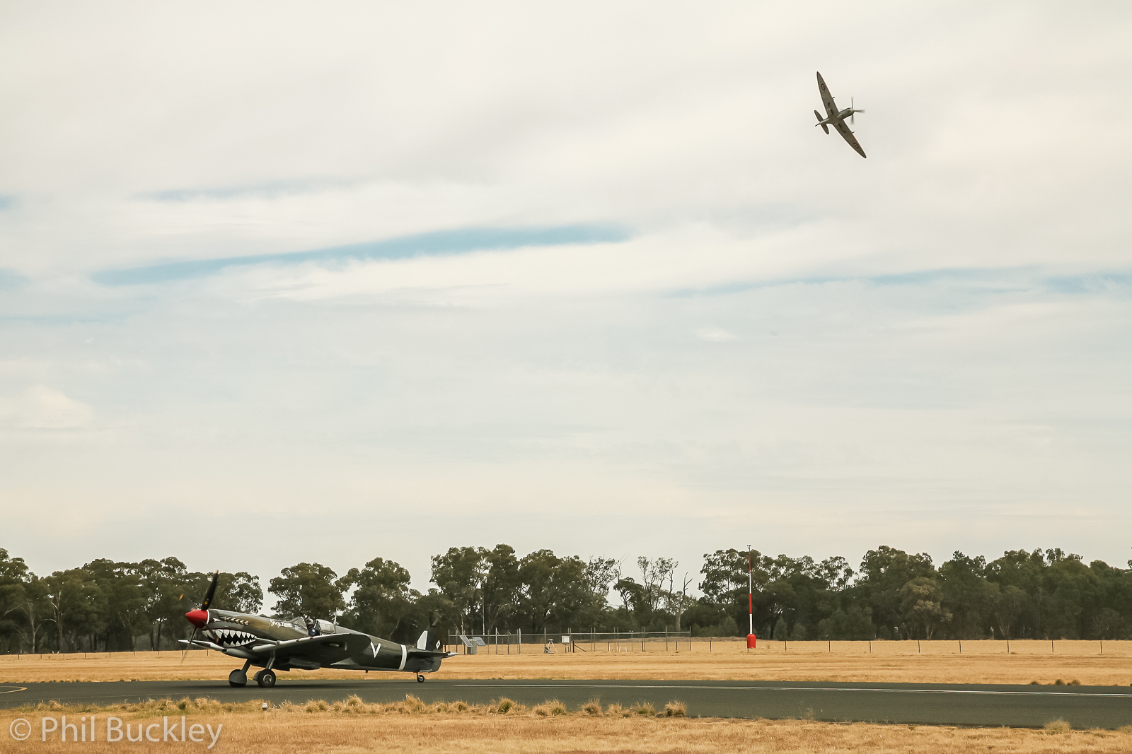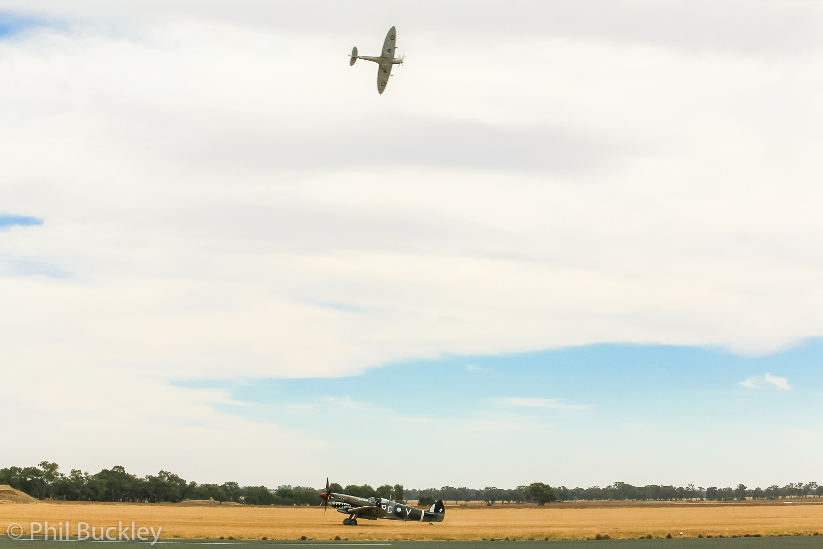 The Temora Aviation Museum’s Spitfire Mk.XVI wheels over the airfield while their Mk.VIII taxies back in below.. (photo by Phil Buckley)