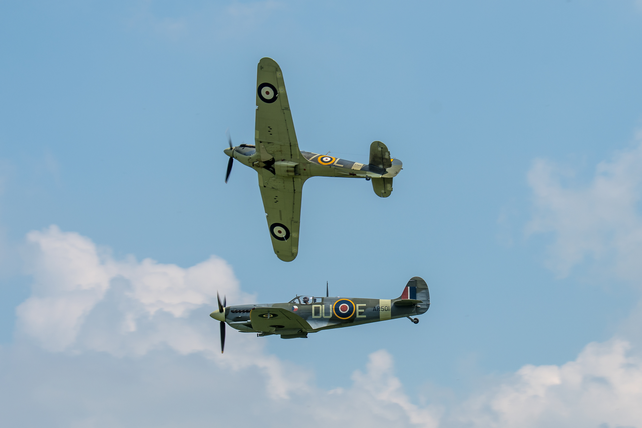 The action packed and fast moving show, opened with the Shuttleworth Collection’s Hawker Sea Hurricane Mk.lb and their newly-restored Supermarine Spitfire Mk.Vc. Next to appear was the first of the visitors, a Hawker Fury Mk.ll belonging to Anglia Aircraft Restorations and operated by Air Leasing. The former Iraqi Air Force fighter is a land-based variant of the Sea Fury, and is currently marked as the first prototype, serial SR661. The thoroughbred fighter gave a classic display that amply showed the power and rate of climb afforded by it’s Bristol Centaurus 18-cylinder radial engine.
