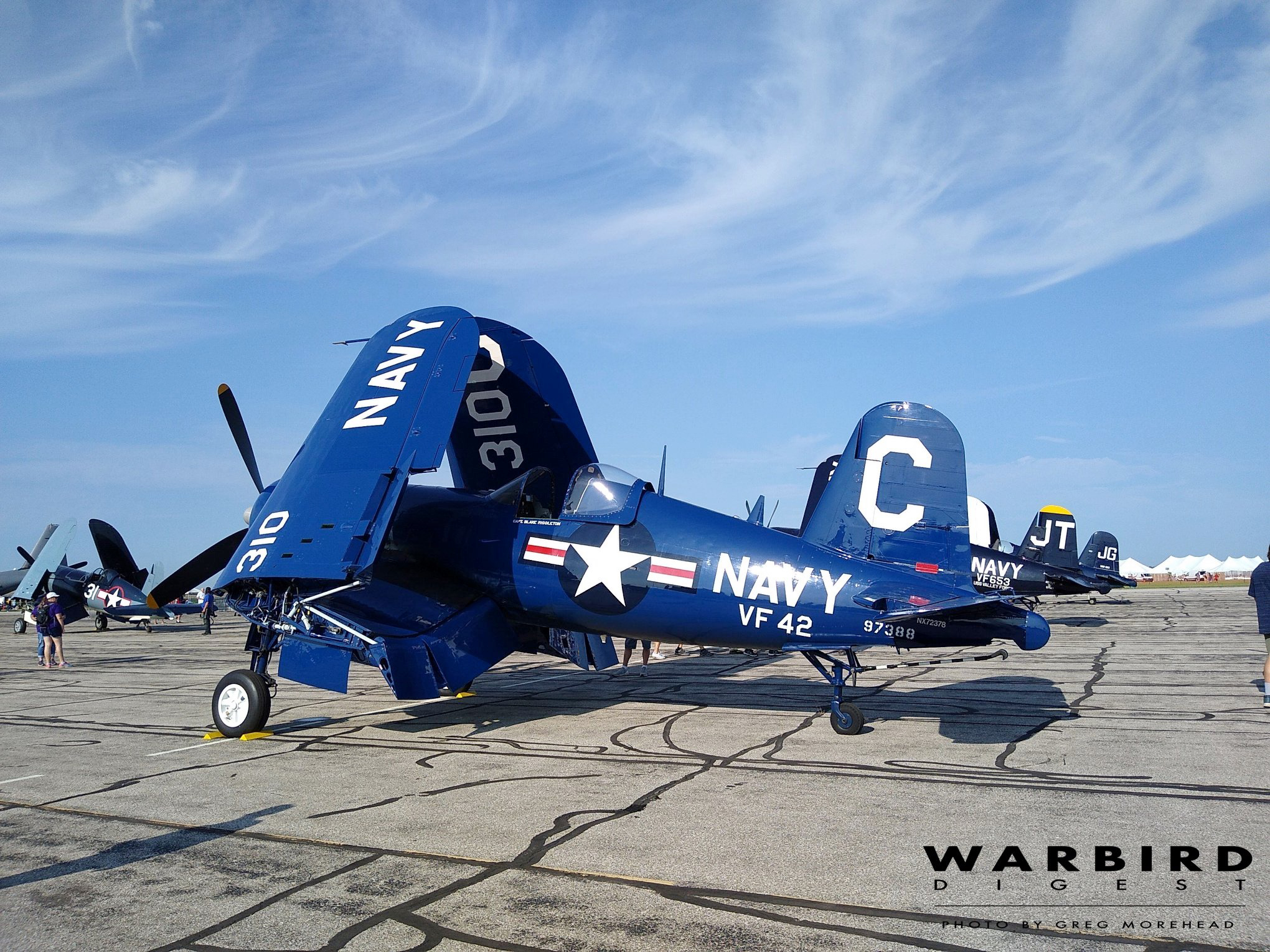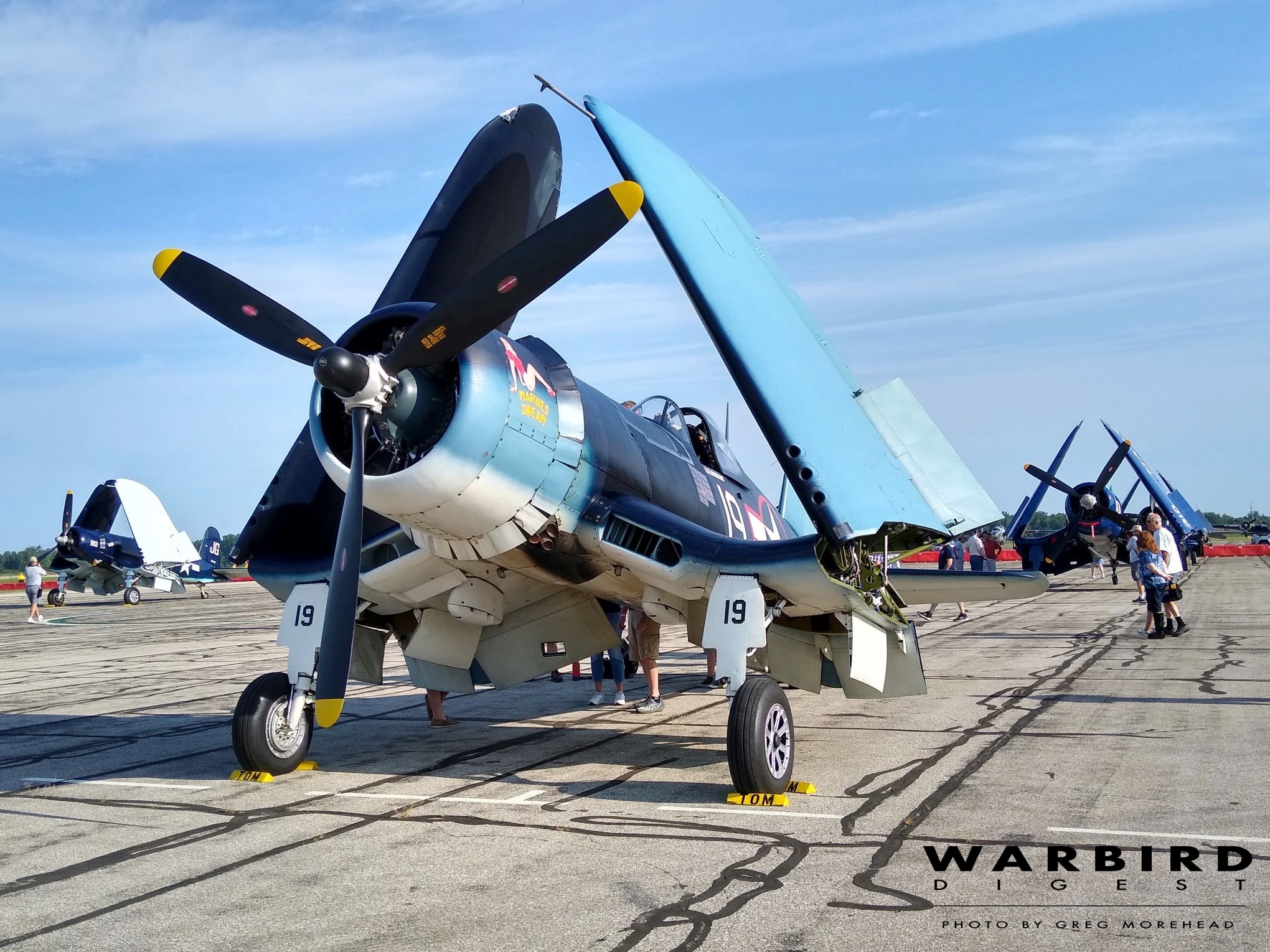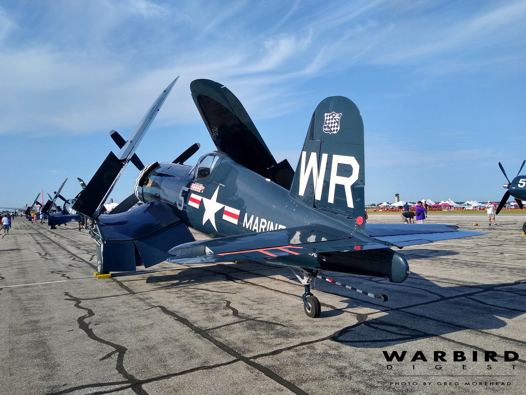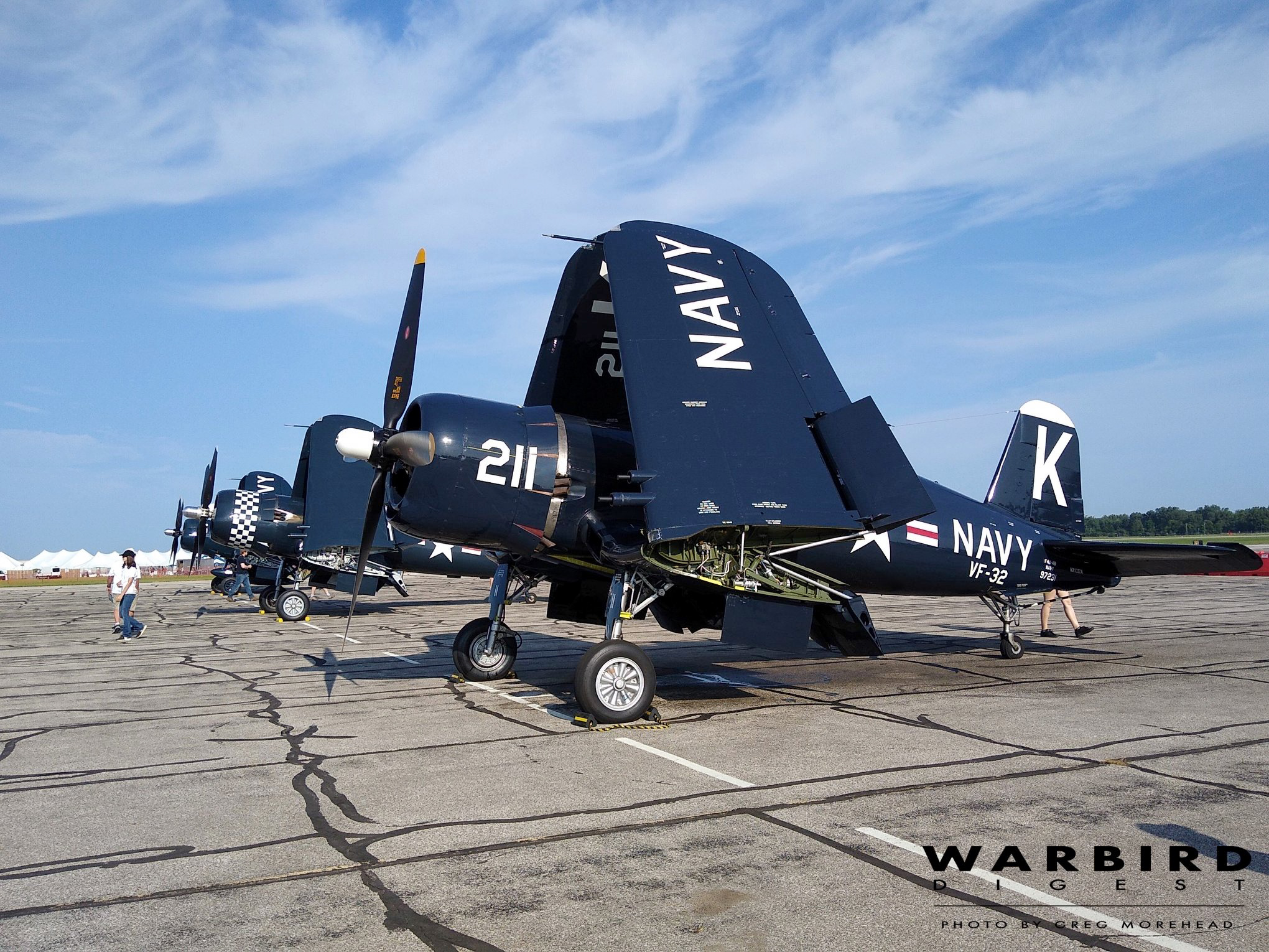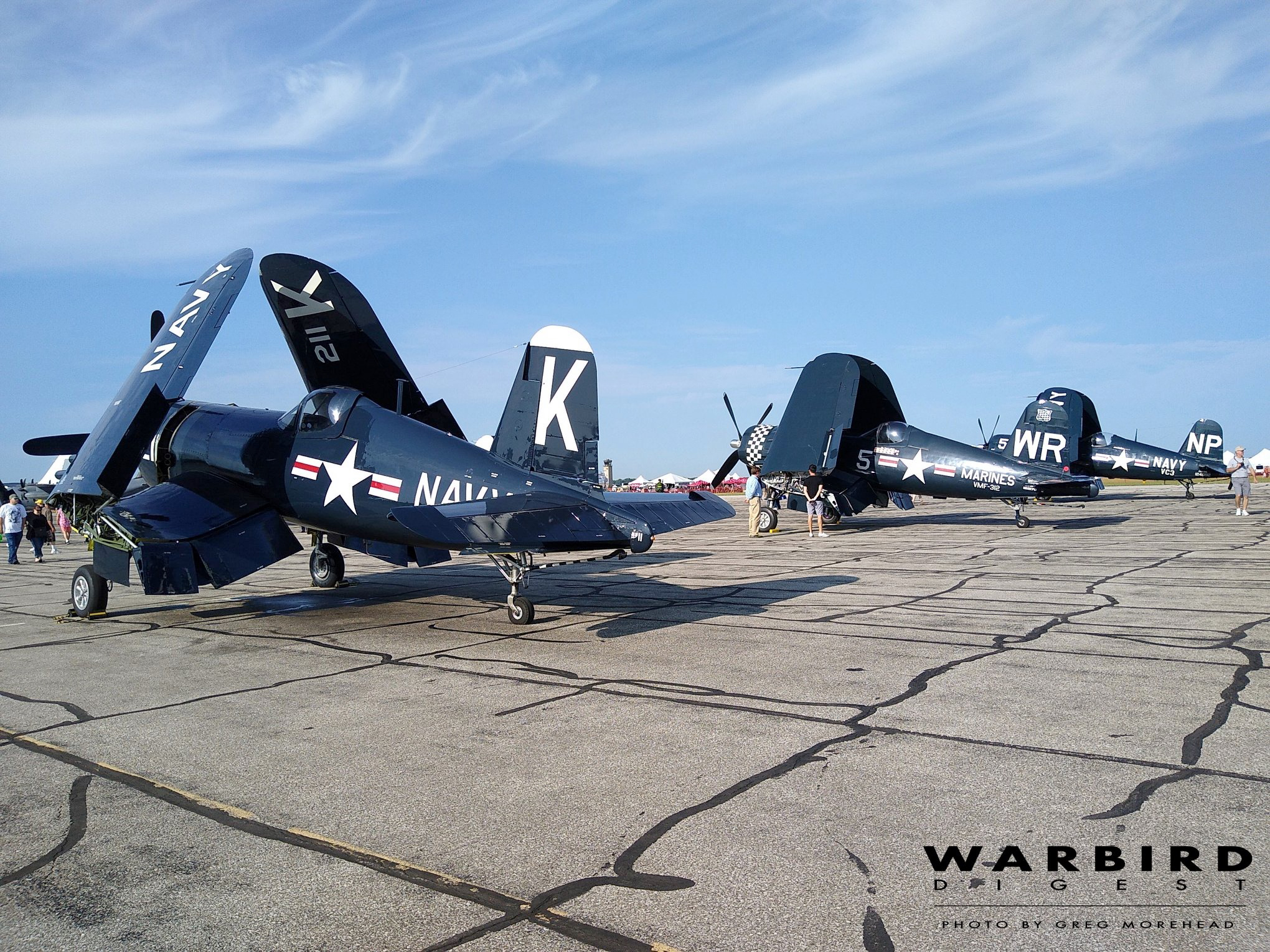 Wings of the North’s F4U-4 Corsair and numerous other examples on the ramp at Willow Run Airport in Ypsilanti, Michigan. (photo by Greg Morehead)