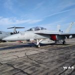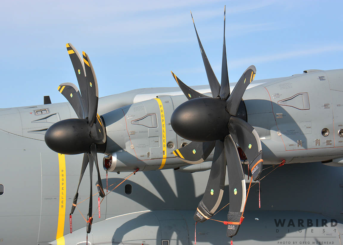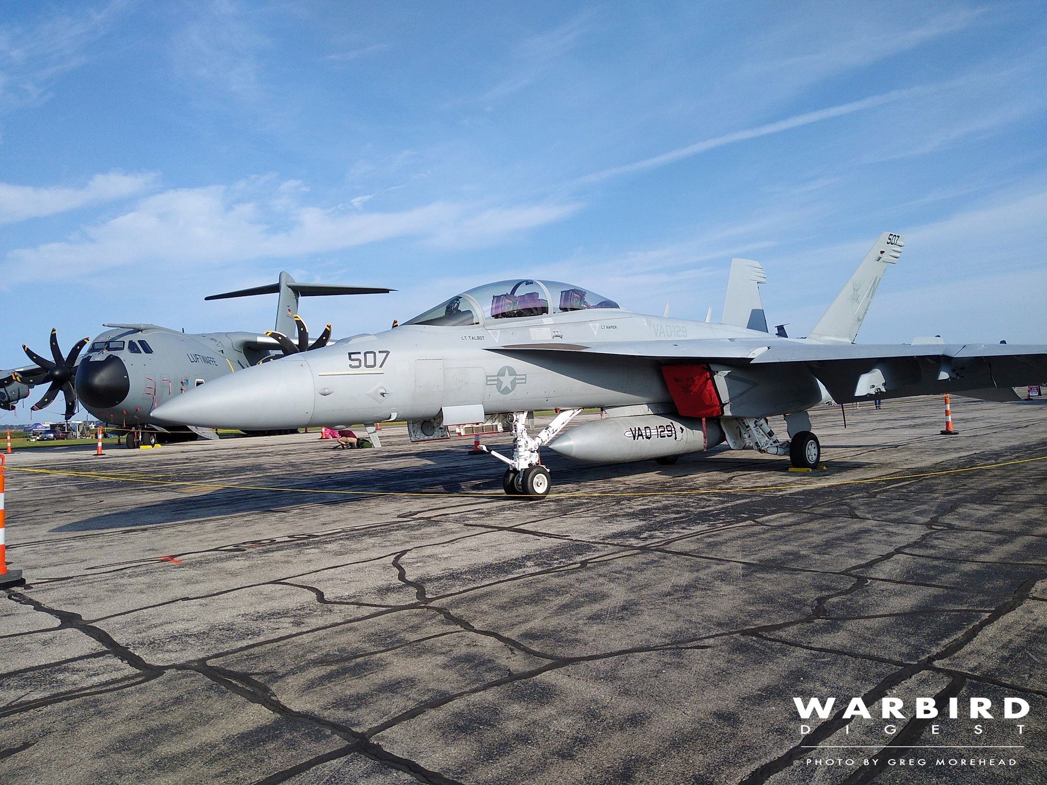 An EF-18G Growler from VAQ-129 at NAS Whidbey Island sits on the ramp at Willow Run with the massive Airbus A400M Atlas from the Luftwaffe to her rear. (photo by Greg Morehead)