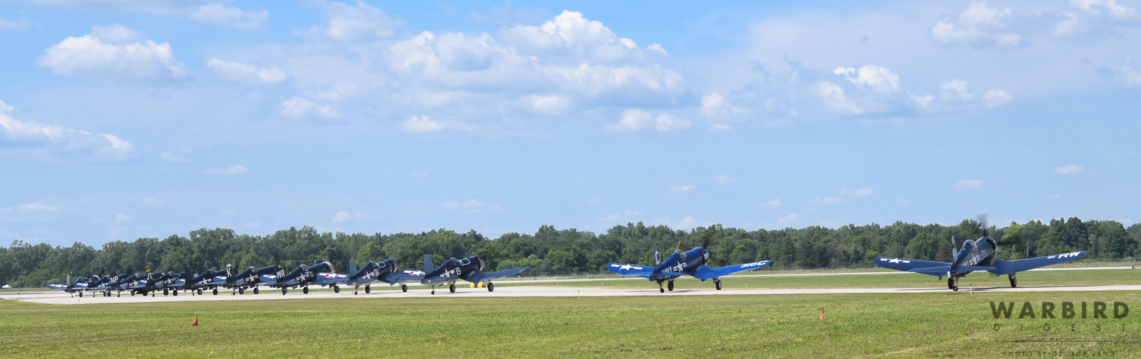 What everyone had come to Thunder Over Michigan to see… ELEVEN Corsairs lined up with engines running for takeoff and a formation flight! (photo by George Land)